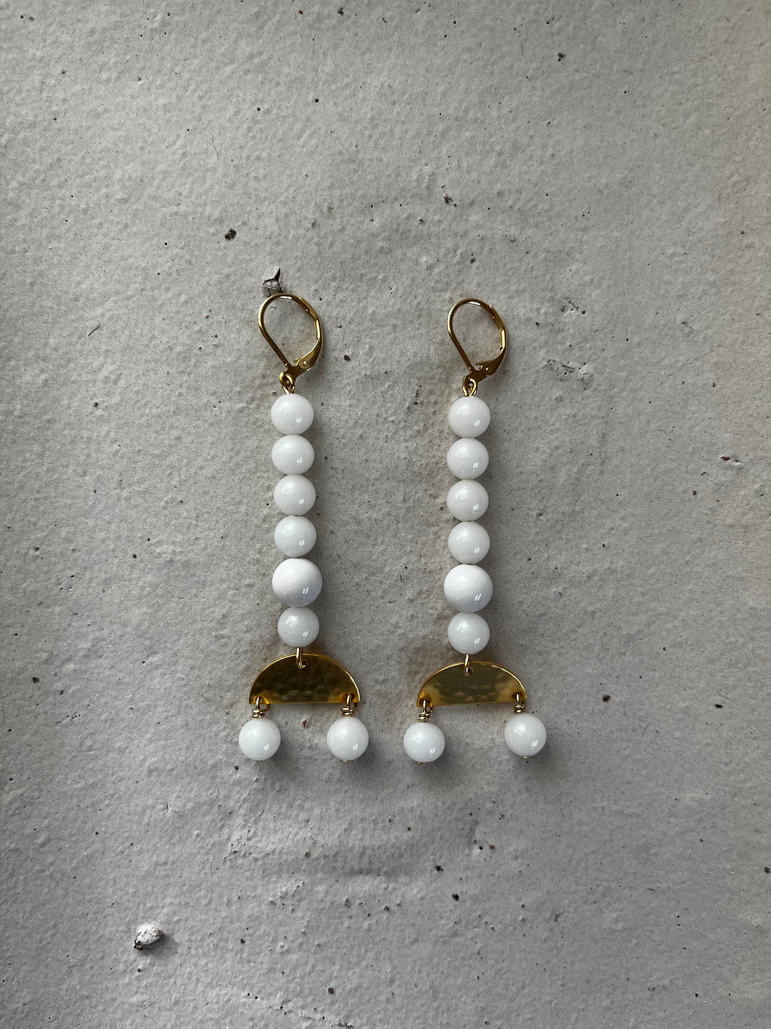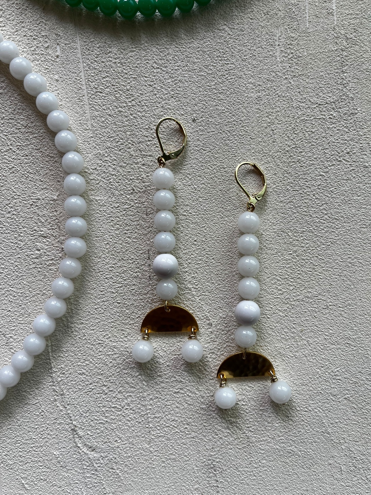 美しい美しいホワイトのビーズ。日本製のヴィンテージガラスです。柔らかいけれど存在感もある乳白色。柔らかな印象の中にも少し引き締めてくれる色が欲しくて、チョークホワイトに近い色の天然石のビーズを一粒だけ入れました。