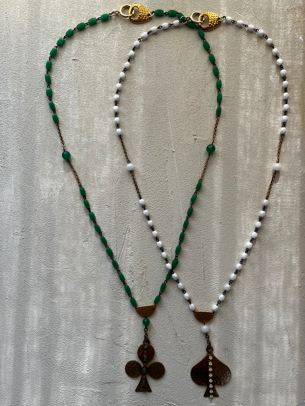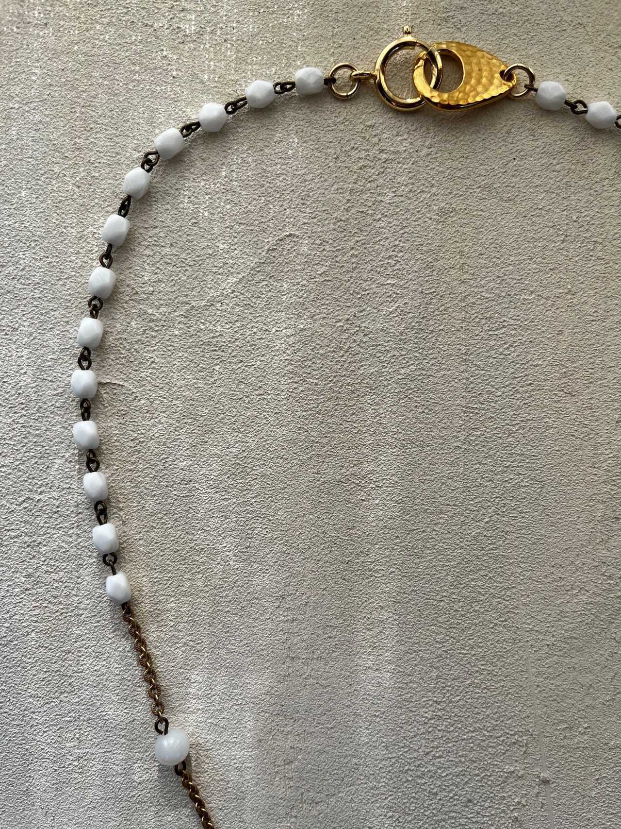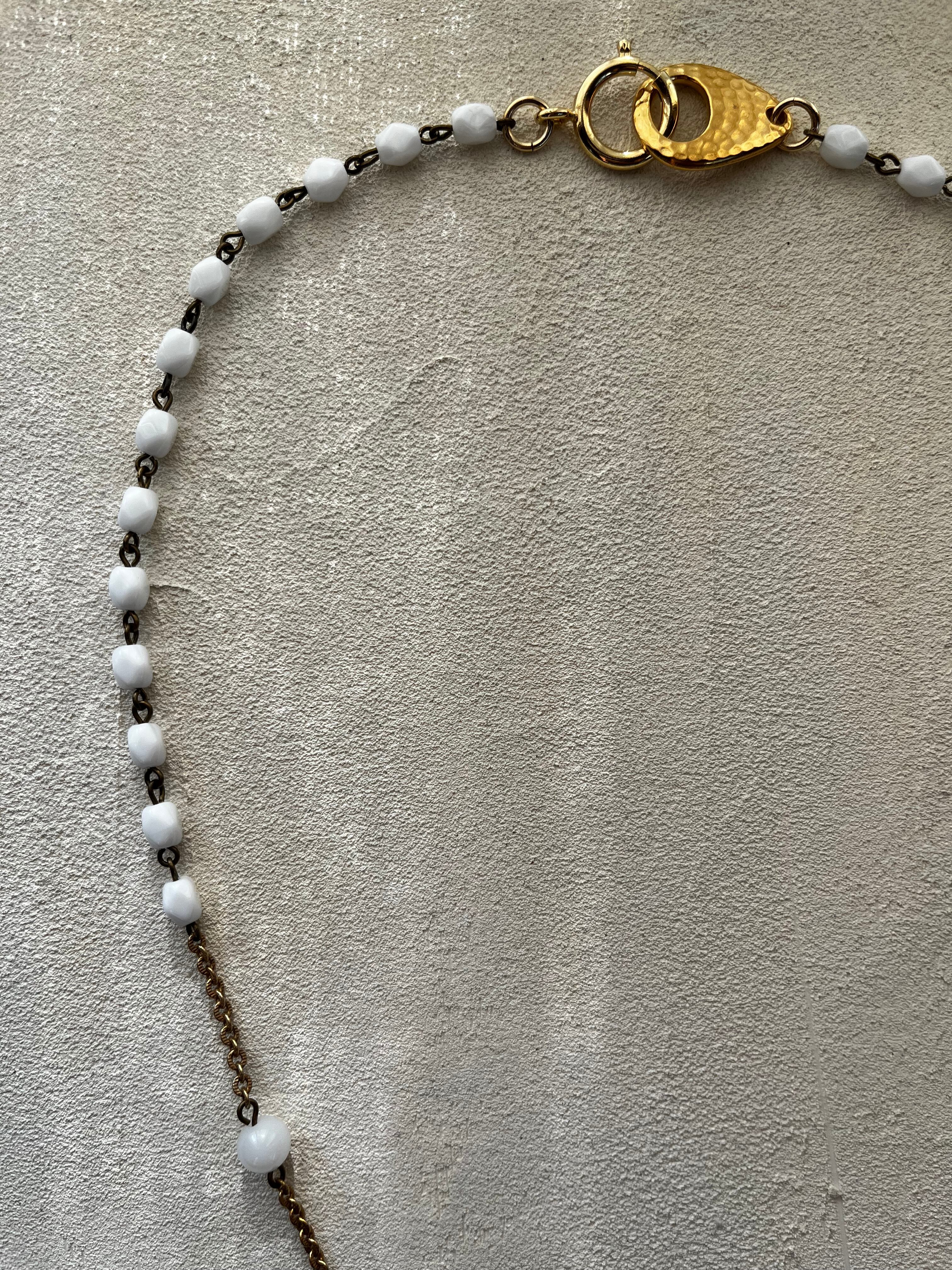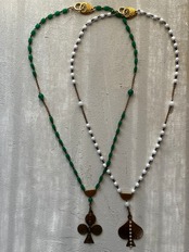 Y字のロザリオをソースに制作したネックレスですが、ビーズの数やトップのクロスではないものにアレンジしているので本来のロザリオとは辿り着いた形はだいぶ変わりましたが、とてもお気に入りの作品が出来ました。
