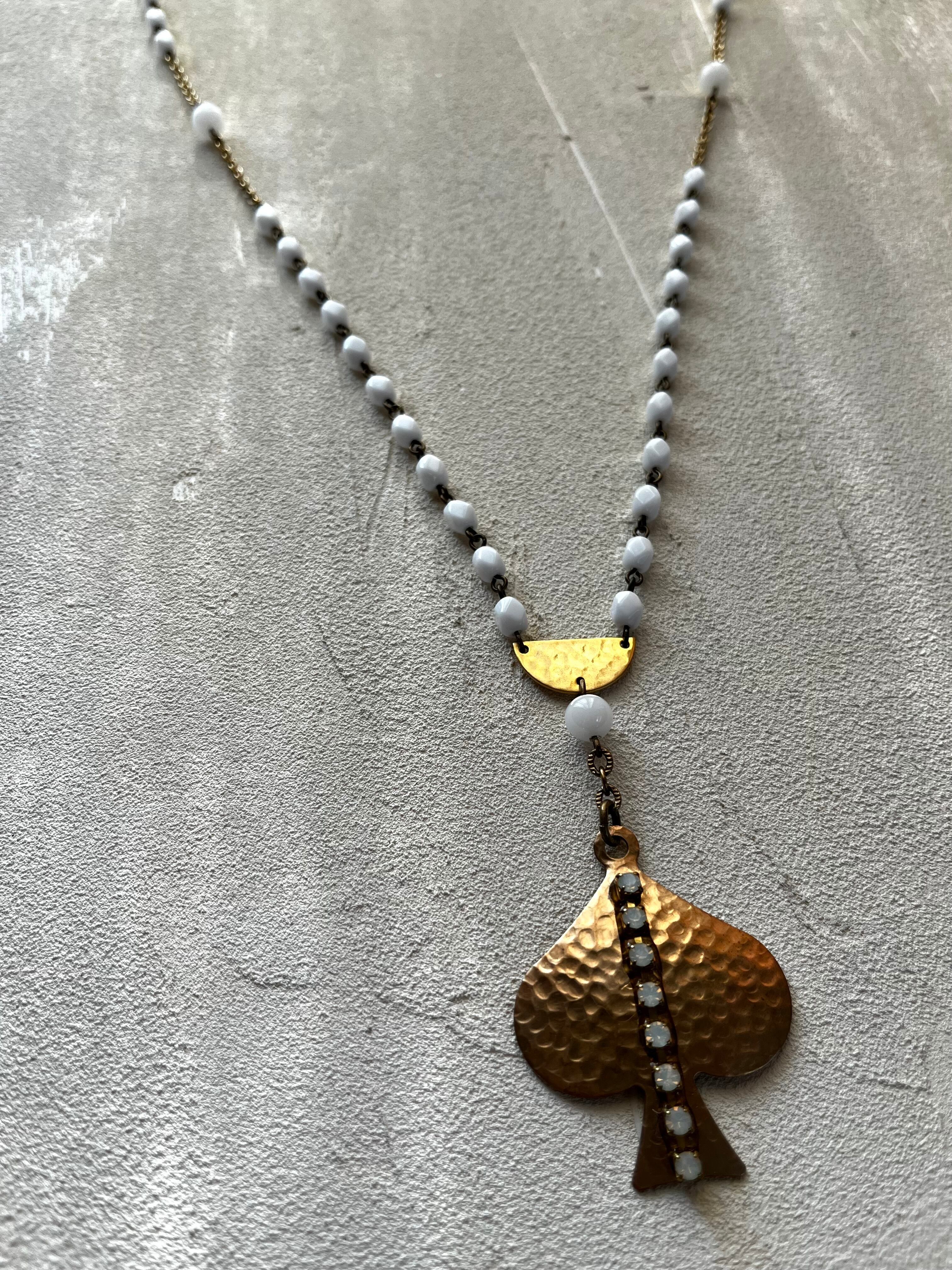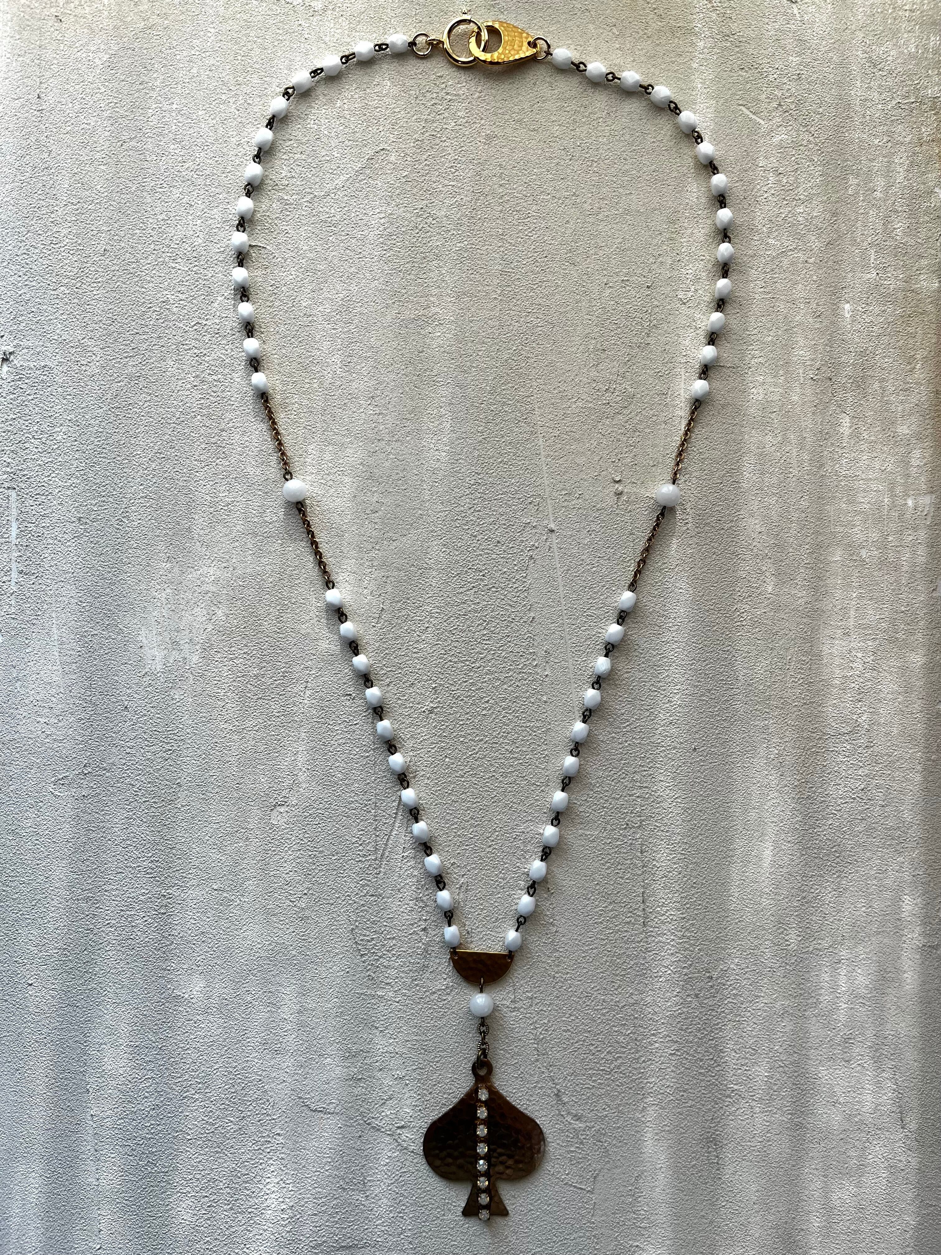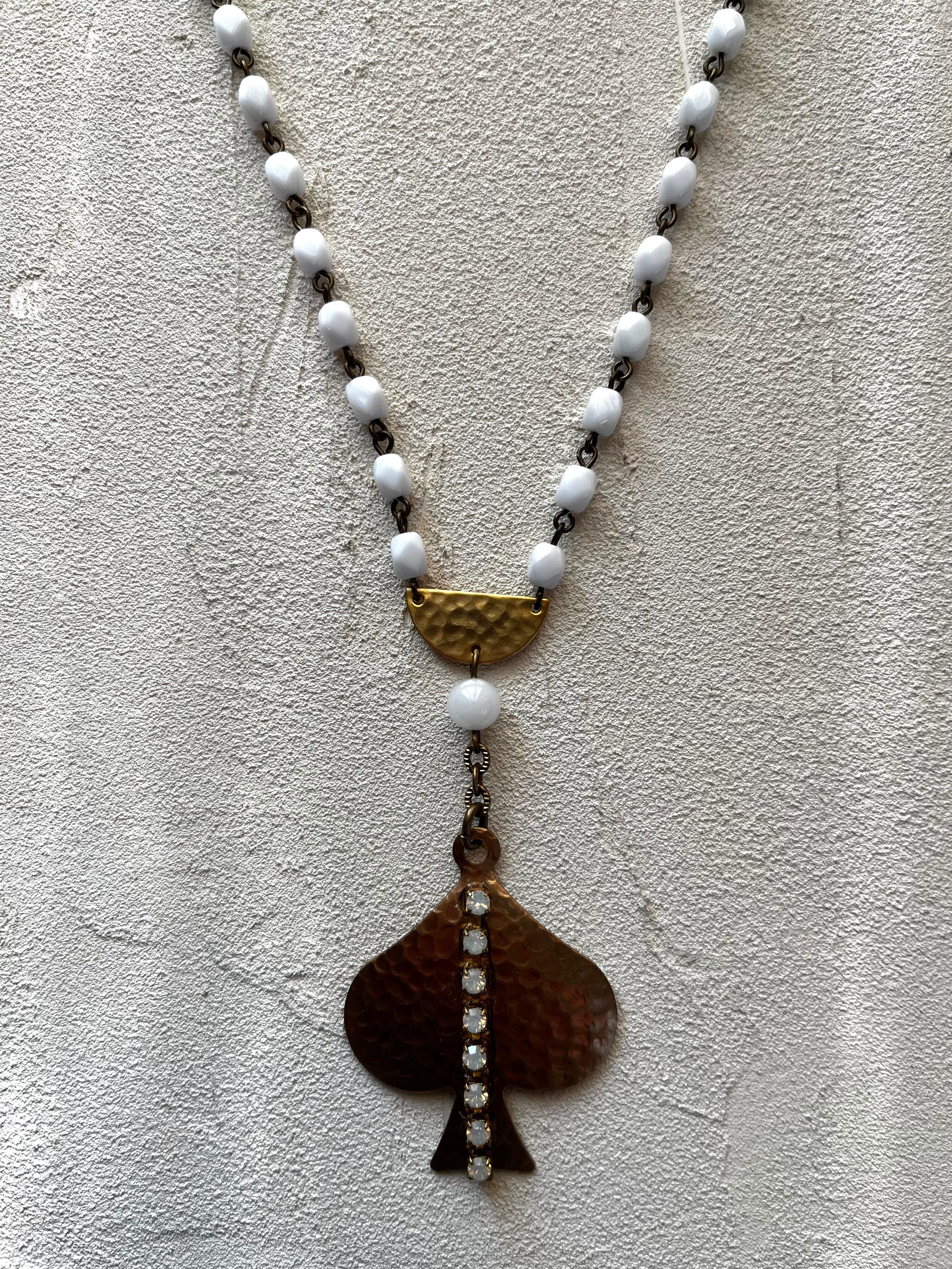 Y字のロザリオをソースに制作したネックレスですが、ビーズの数やトップのクロスではないものにアレンジしているので本来のロザリオとは辿り着いた形はだいぶ変わりましたが、とてもお気に入りの作品が出来ました。