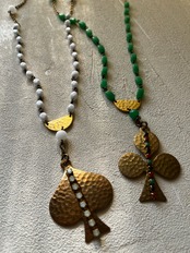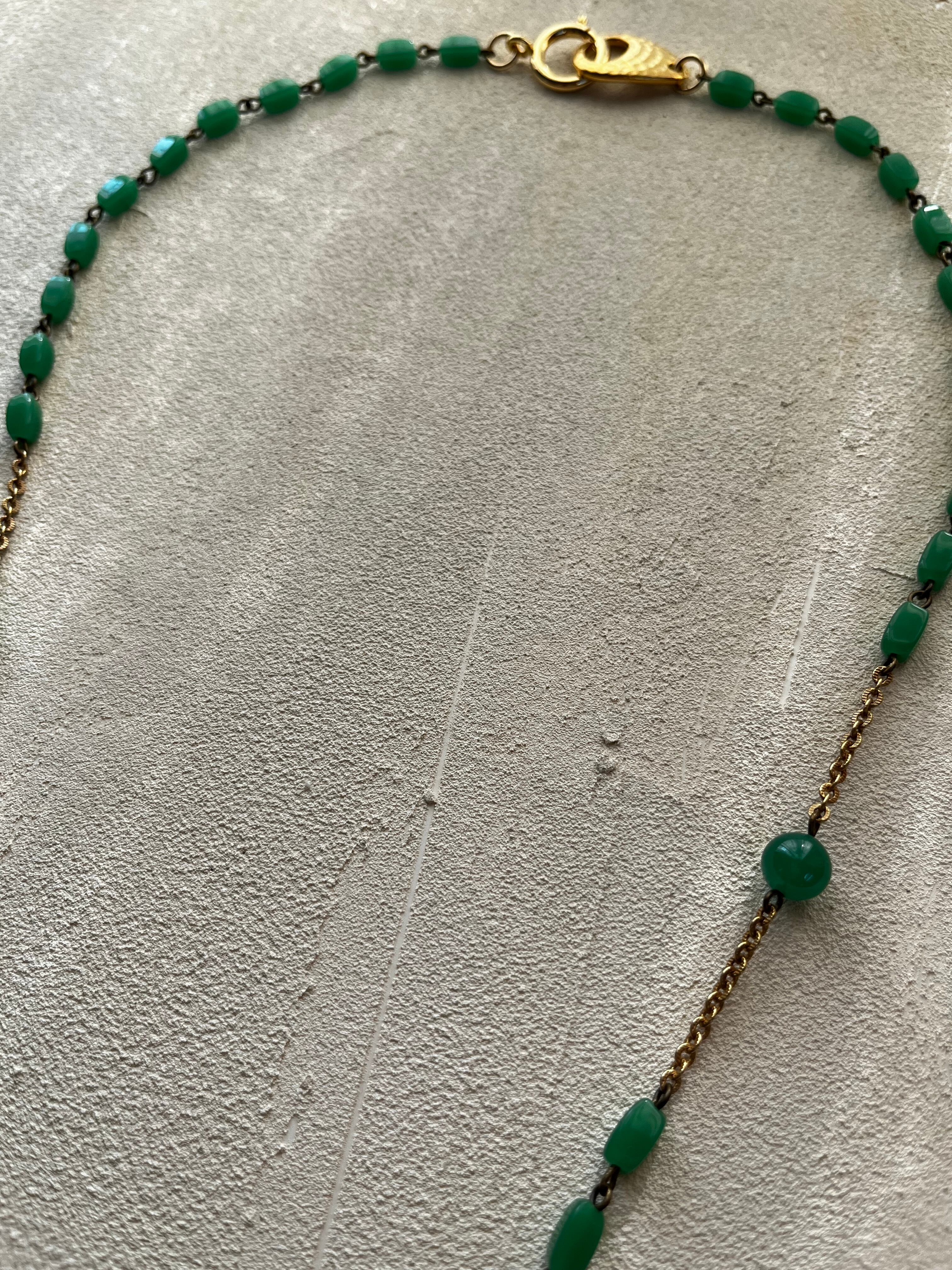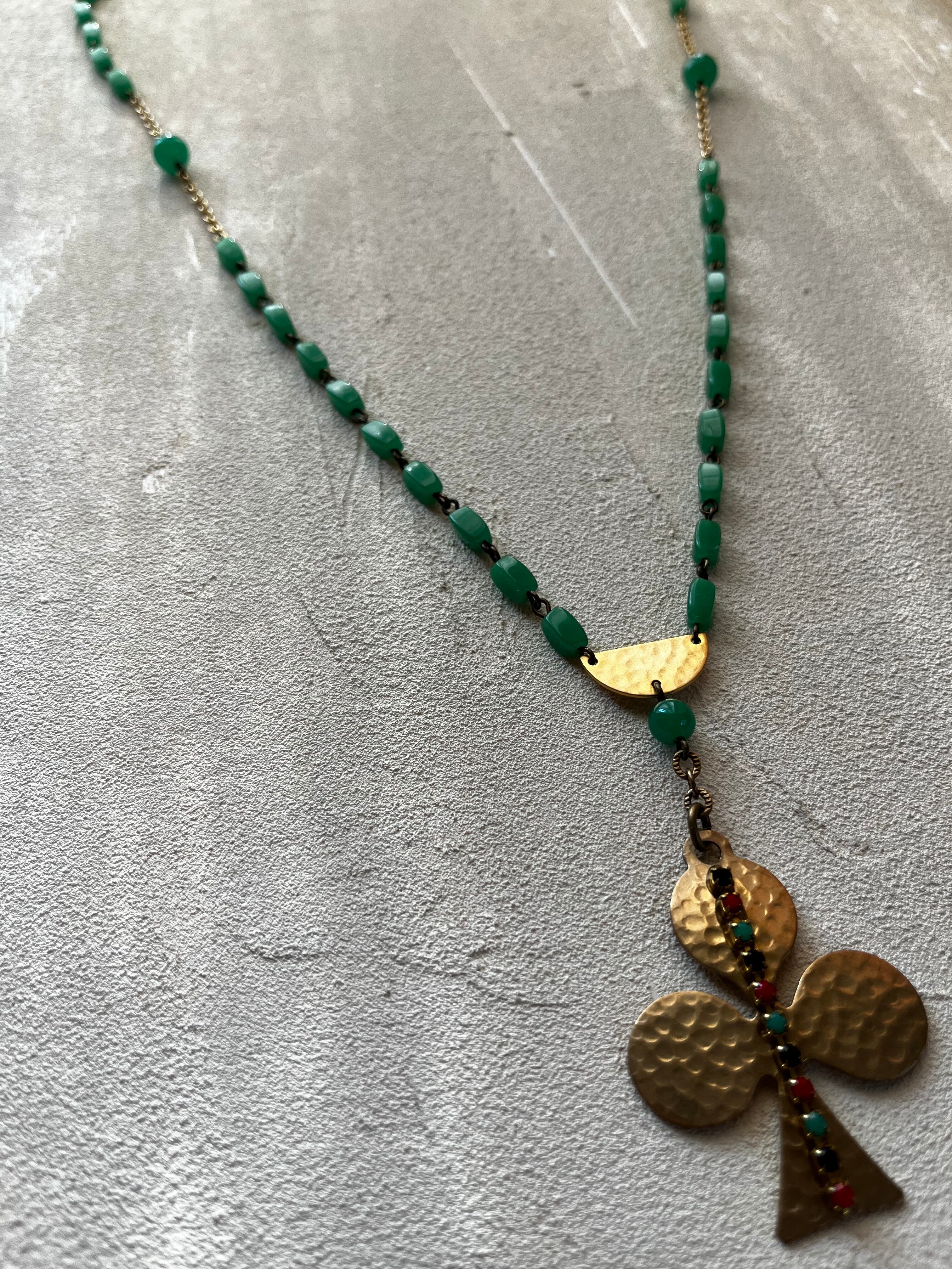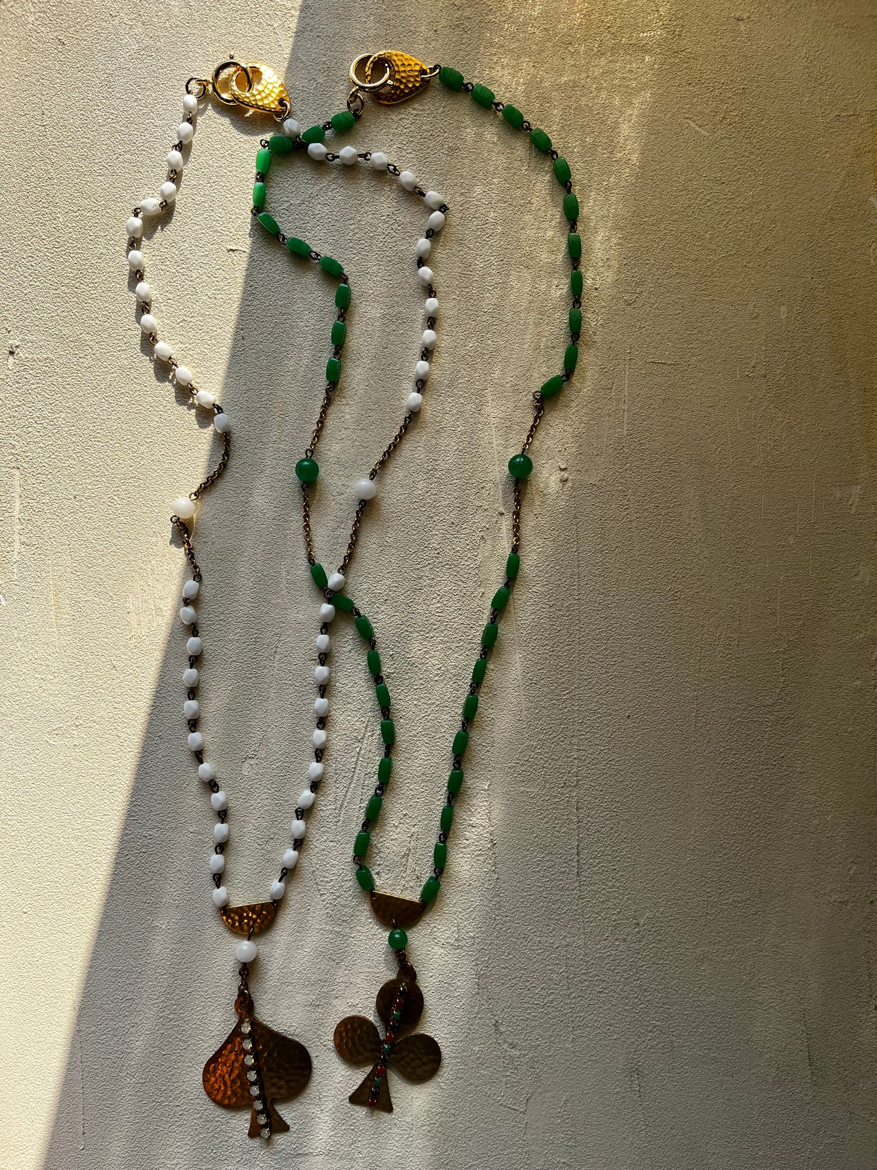Y字のロザリオをソースに制作したネックレスですが、ビーズの数やトップのクロスではないものにアレンジしているので本来のロザリオとは辿り着いた形はだいぶ変わりましたが、とてもお気に入りの作品が出来ました。