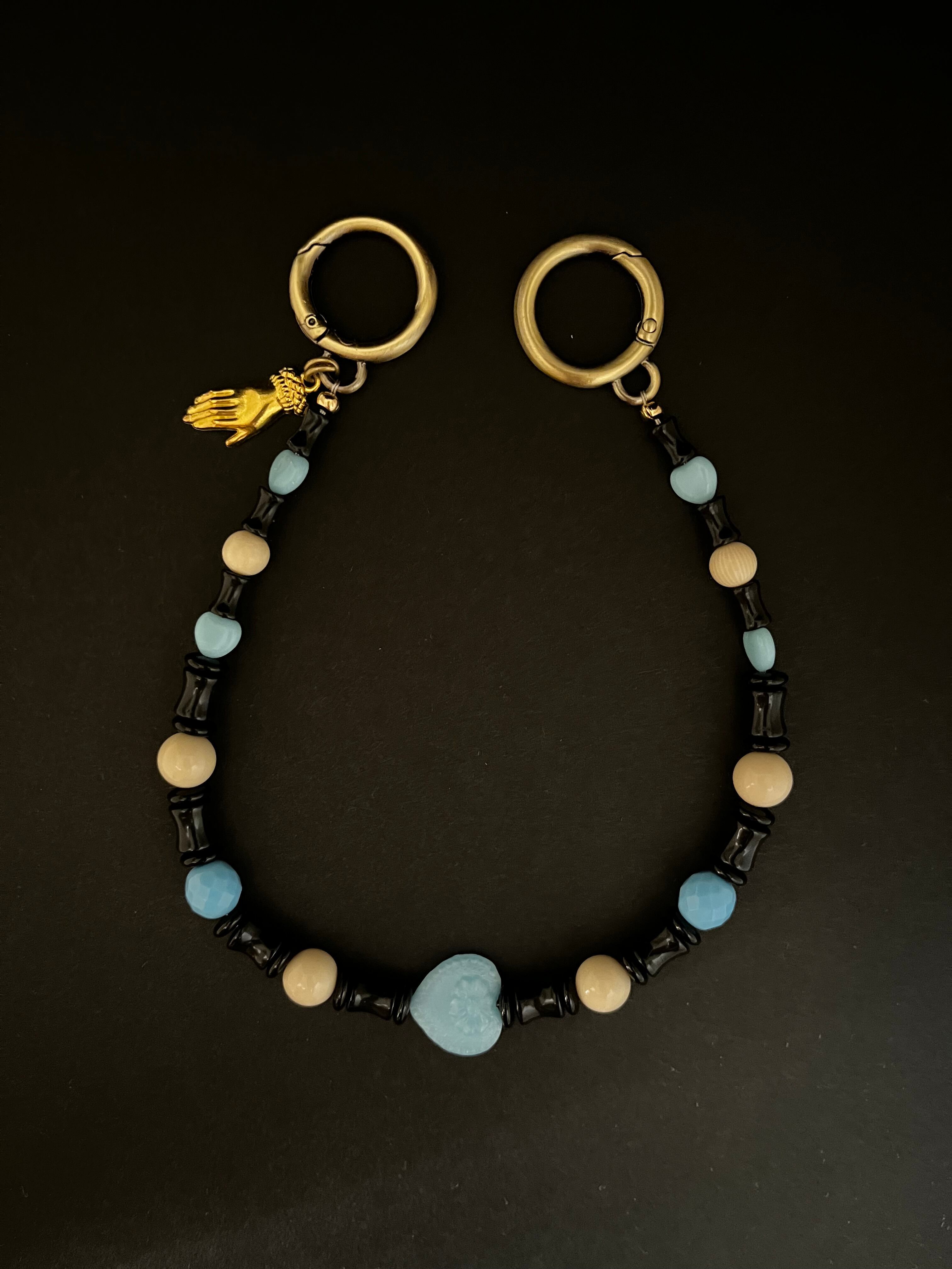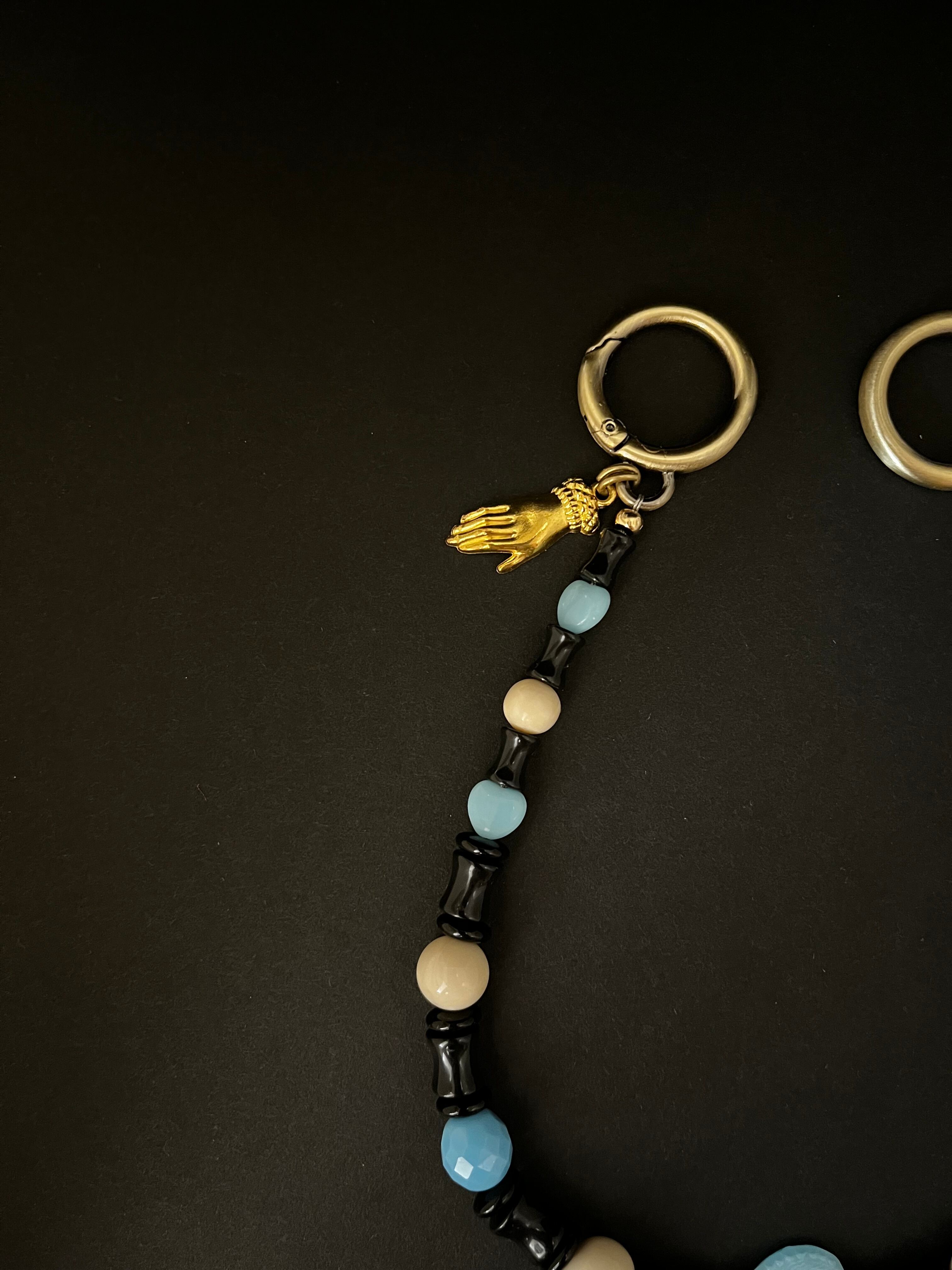引っかける場所のある携帯ケースに付けて手首にかけられるストラップとして、カバンに付けてチャームとして、鍵を付けてキーホルダーにもお使いいただけます。