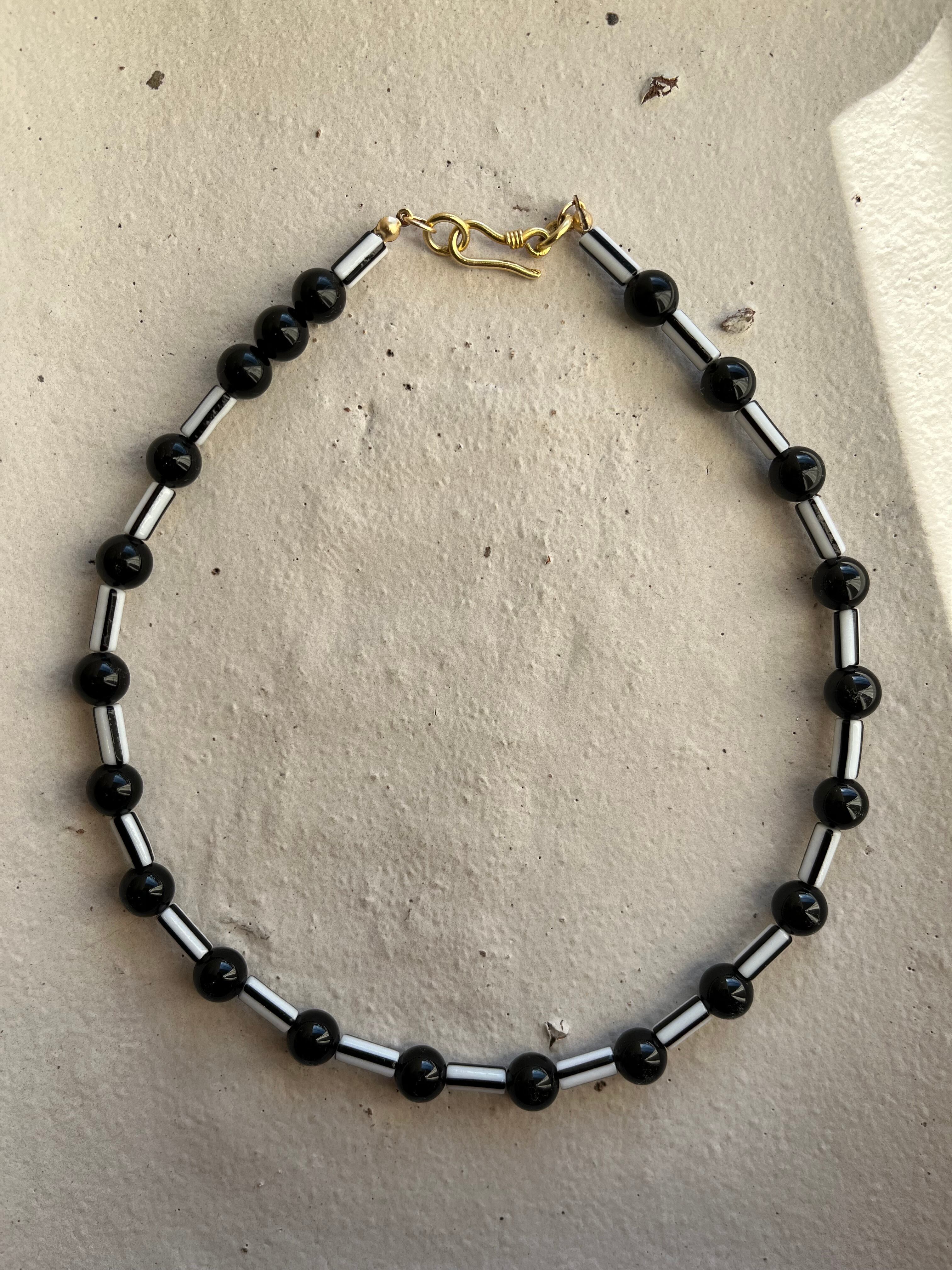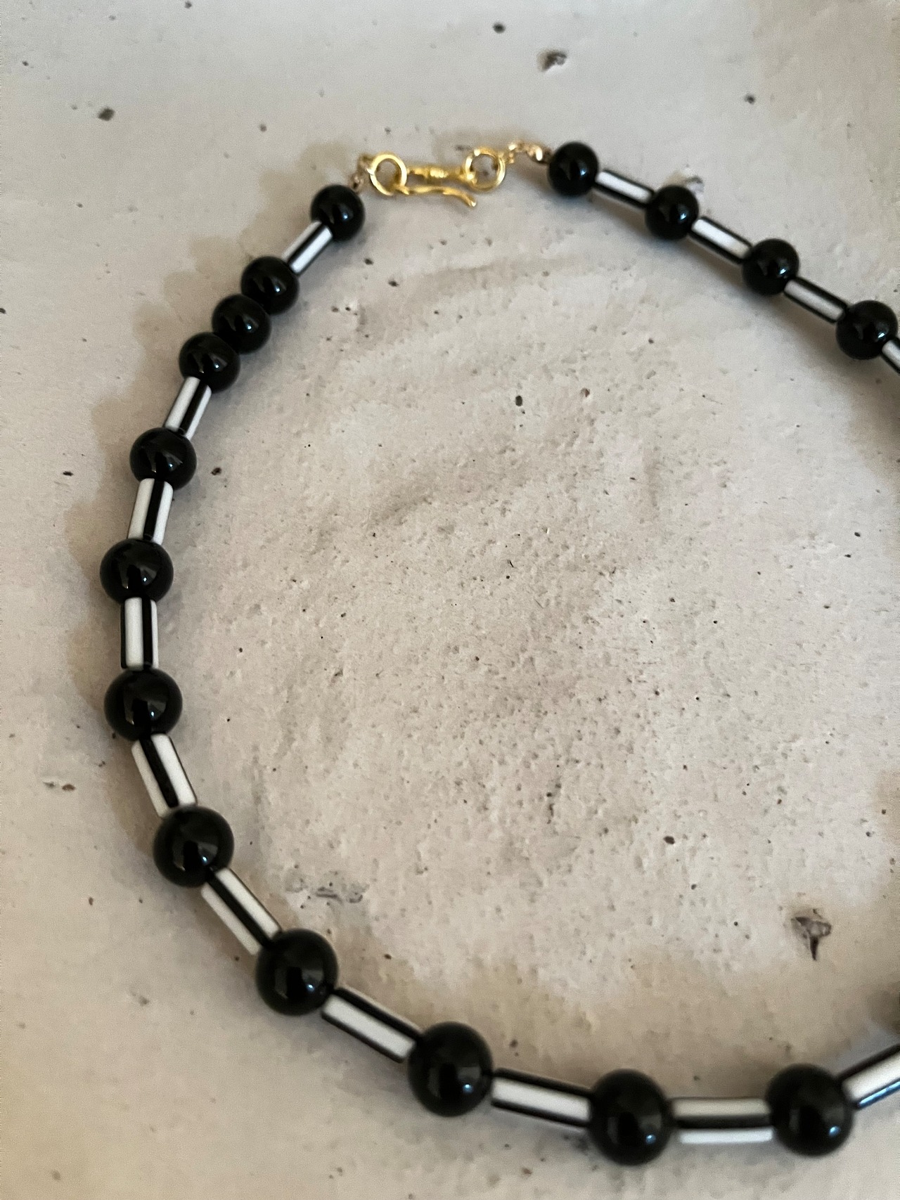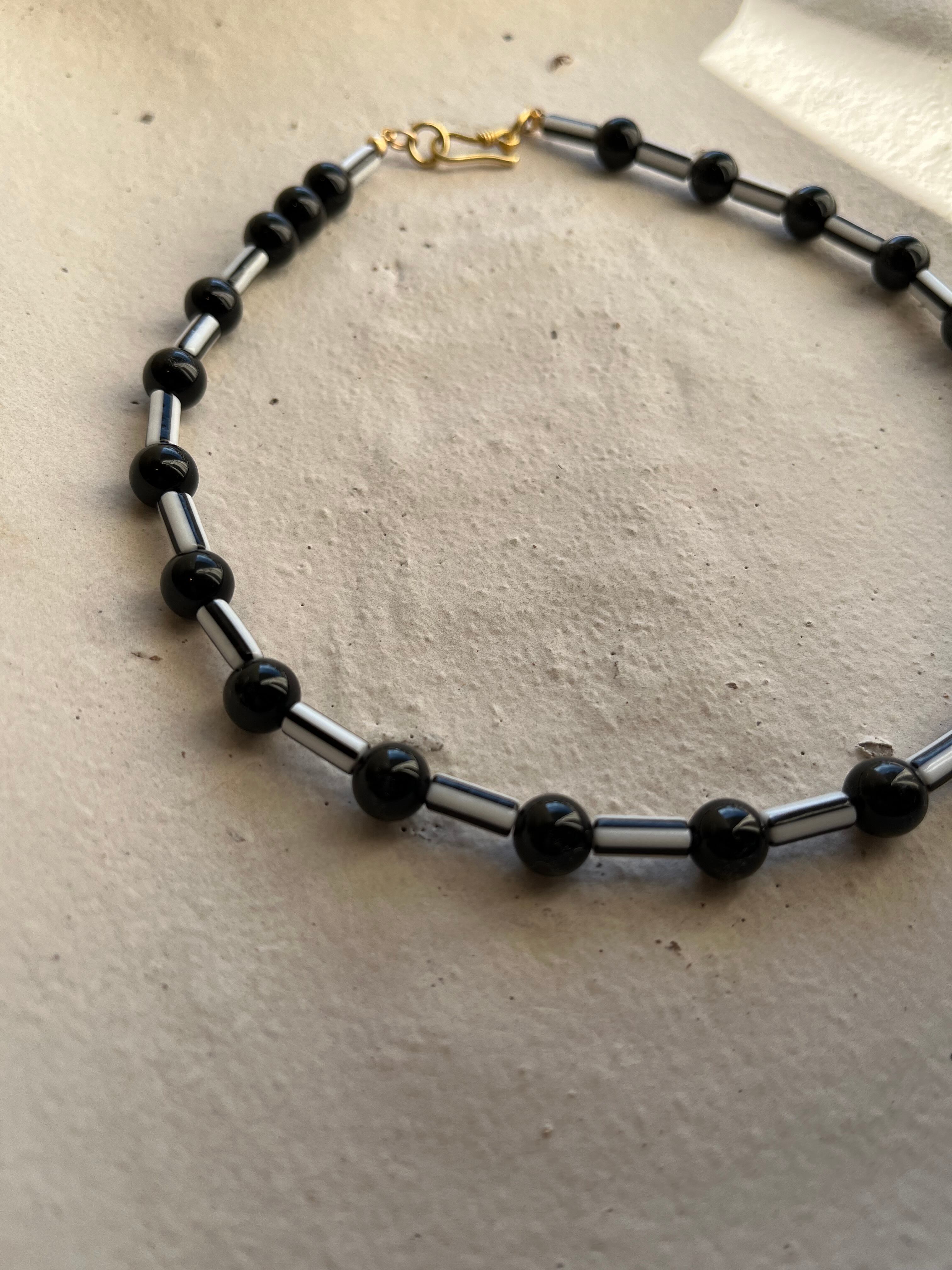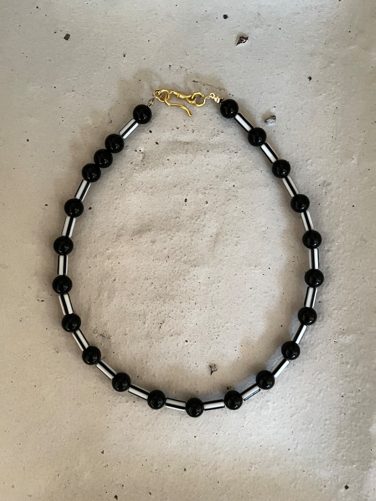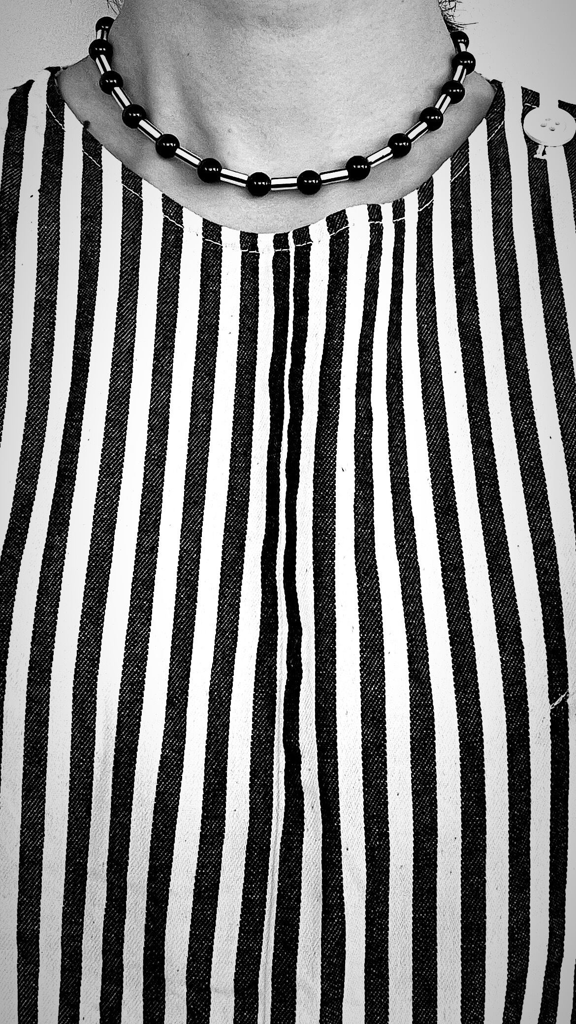 つやつやのブラックオニキスの丸玉ビーズと、ストライプの筒状のガラスビーズを並べたチョーカー。正球に近いオニキスと手作りならではの揺らぎのあるストライプビーズの組み合わせはシティにもバカンスにも合います。