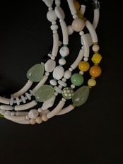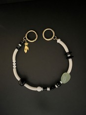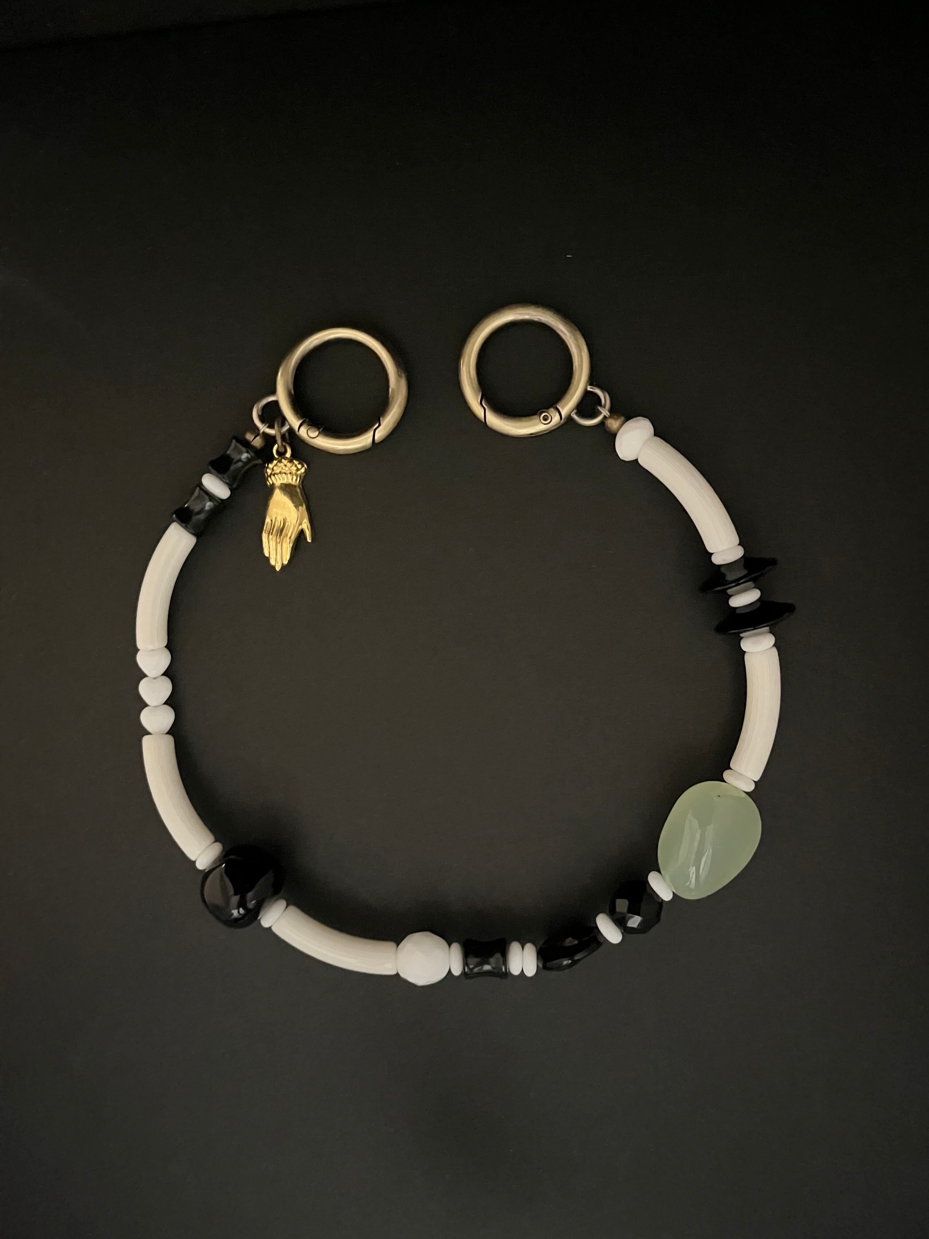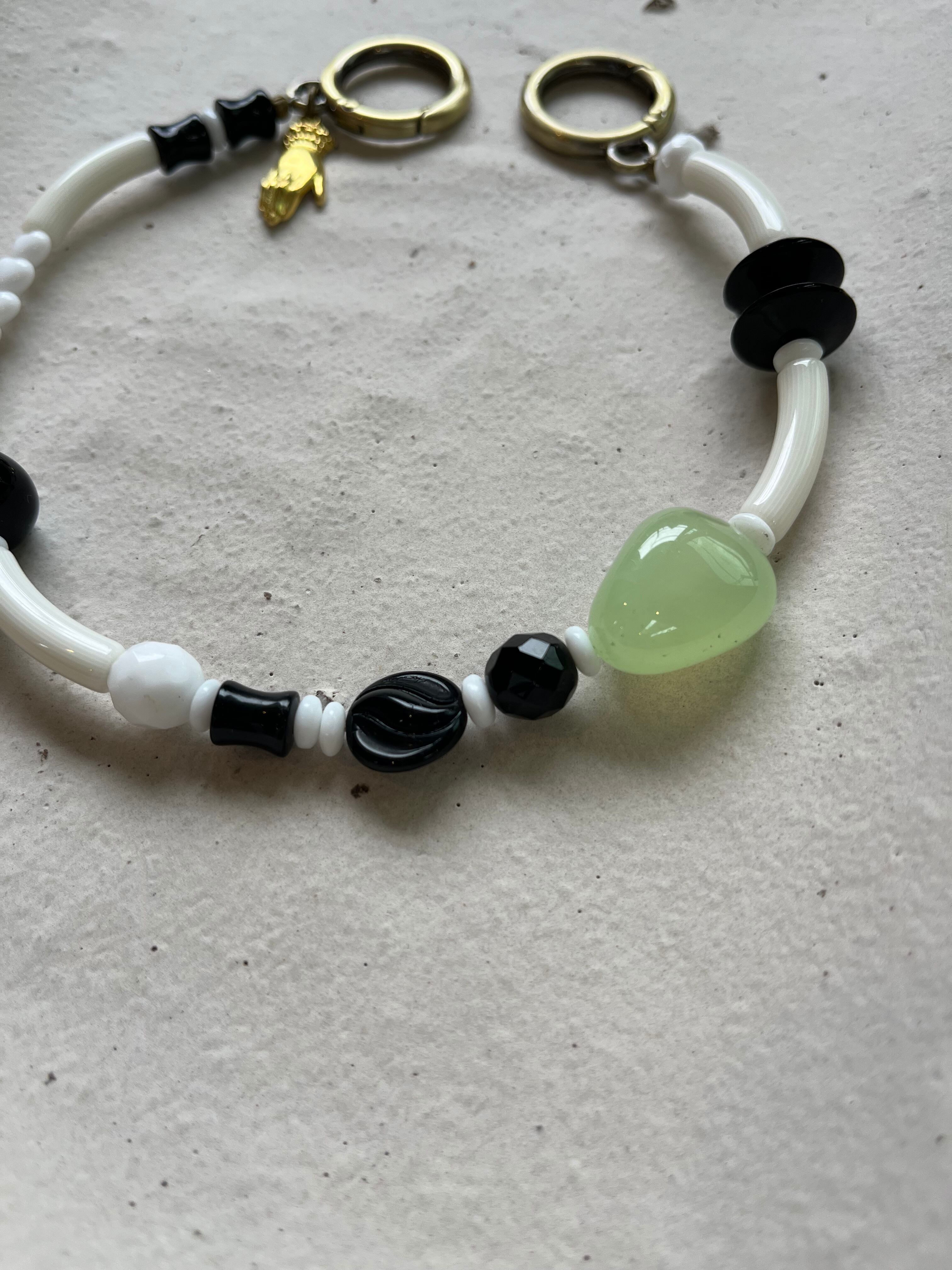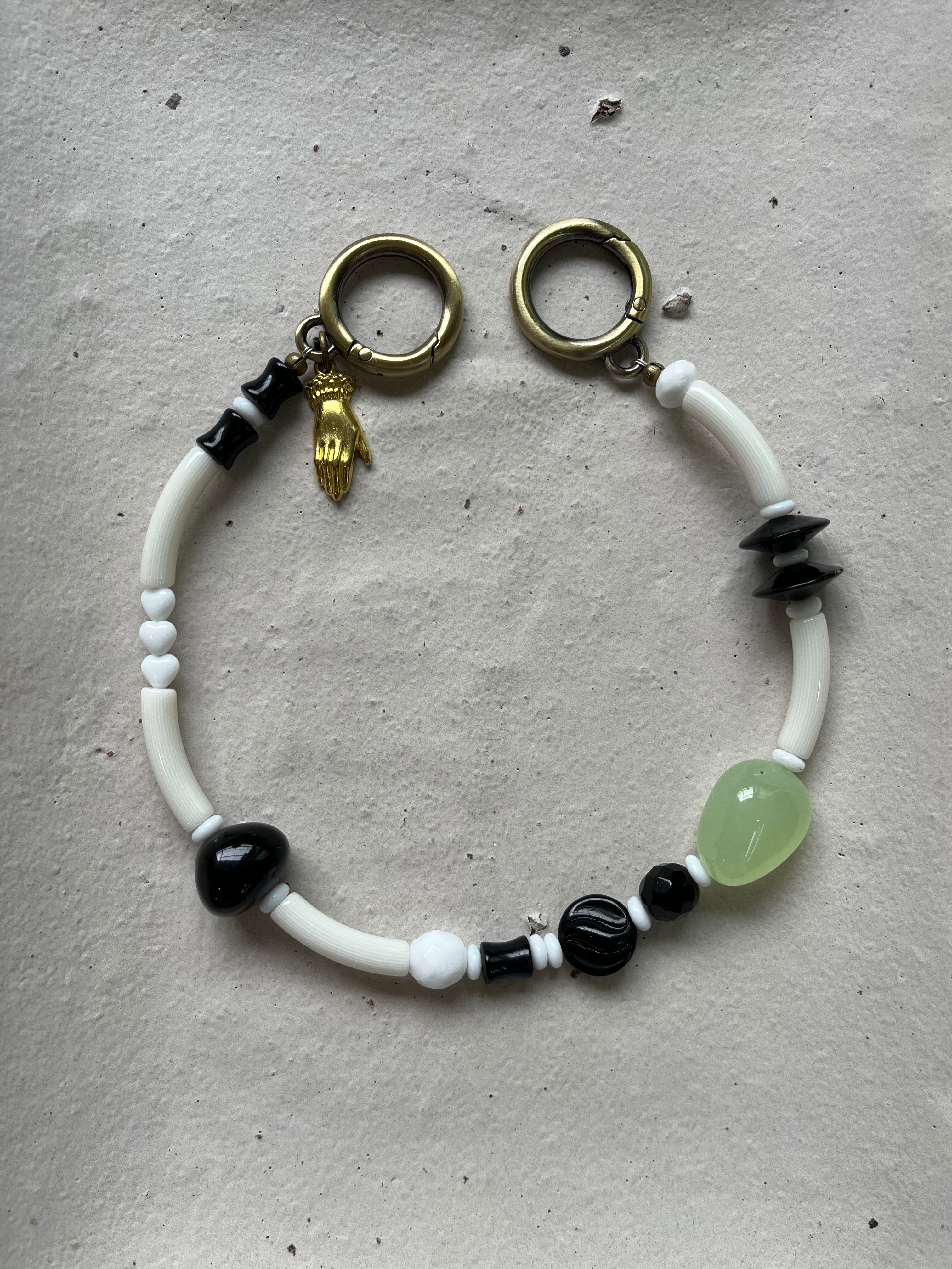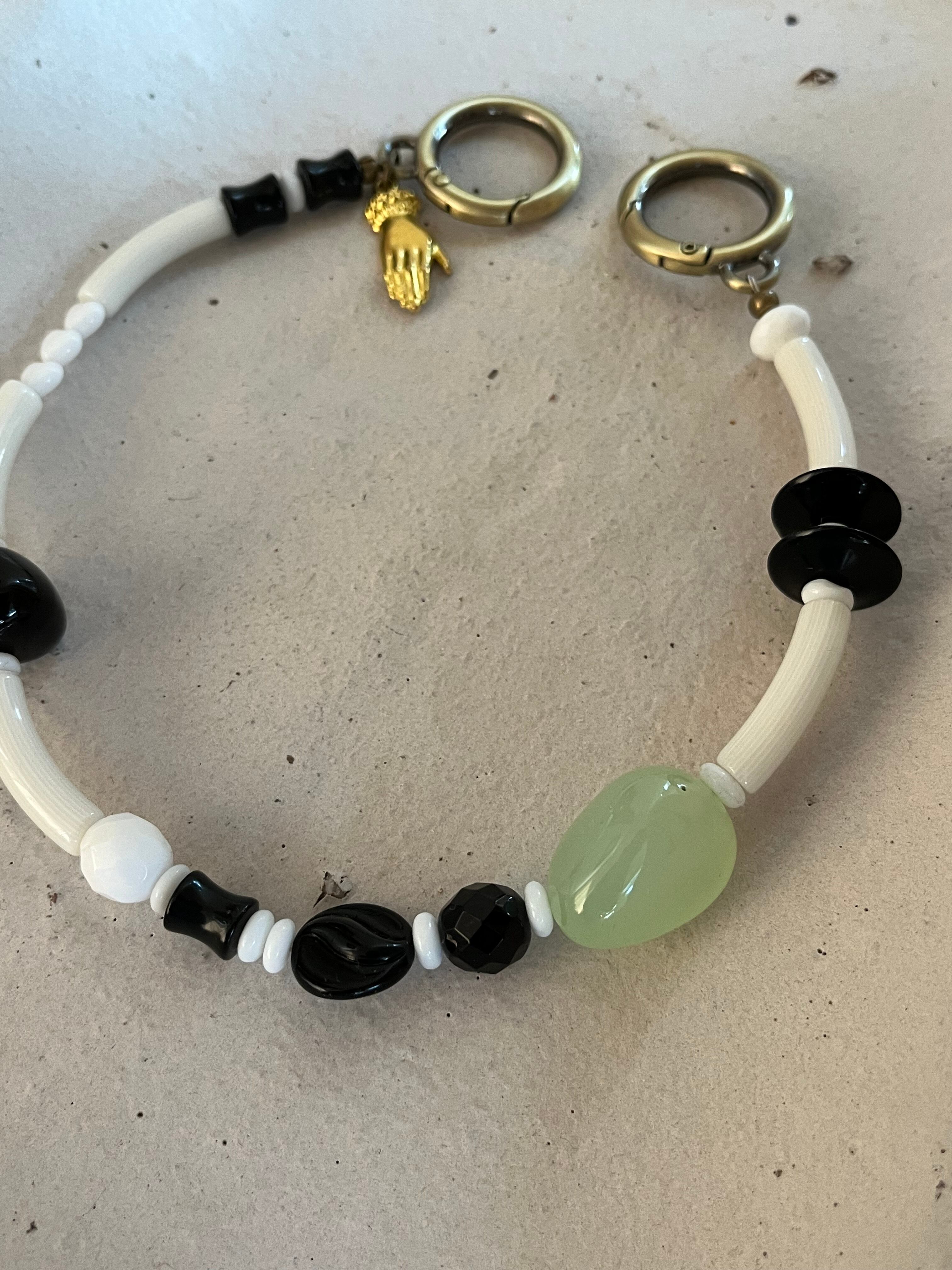 素材や色をミックスして楽しめる一点ものの携帯ストラップをWhite×Blackトーンで作りました。美しい乳白グリーンのカルセドニーをポイントに。気まぐれなパーツ並びのようにみえますがバランスや色合い、素材合わせにもこだわりました。パーツは現代のものの中にヴィンテージビーズもいくつか入れています。