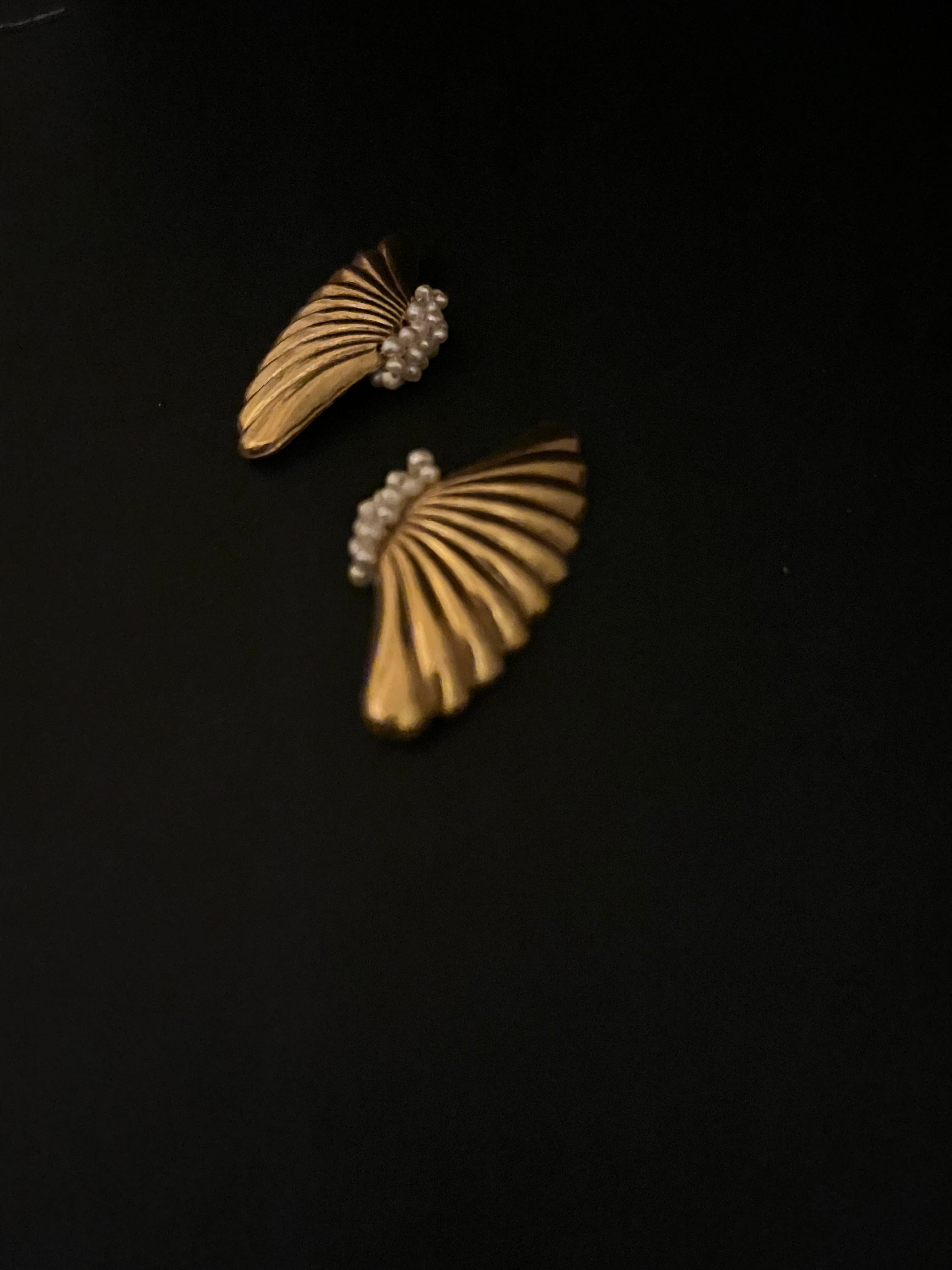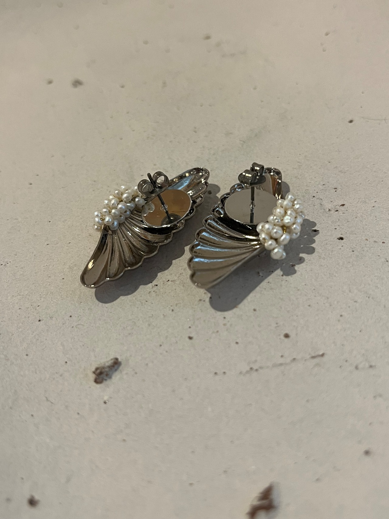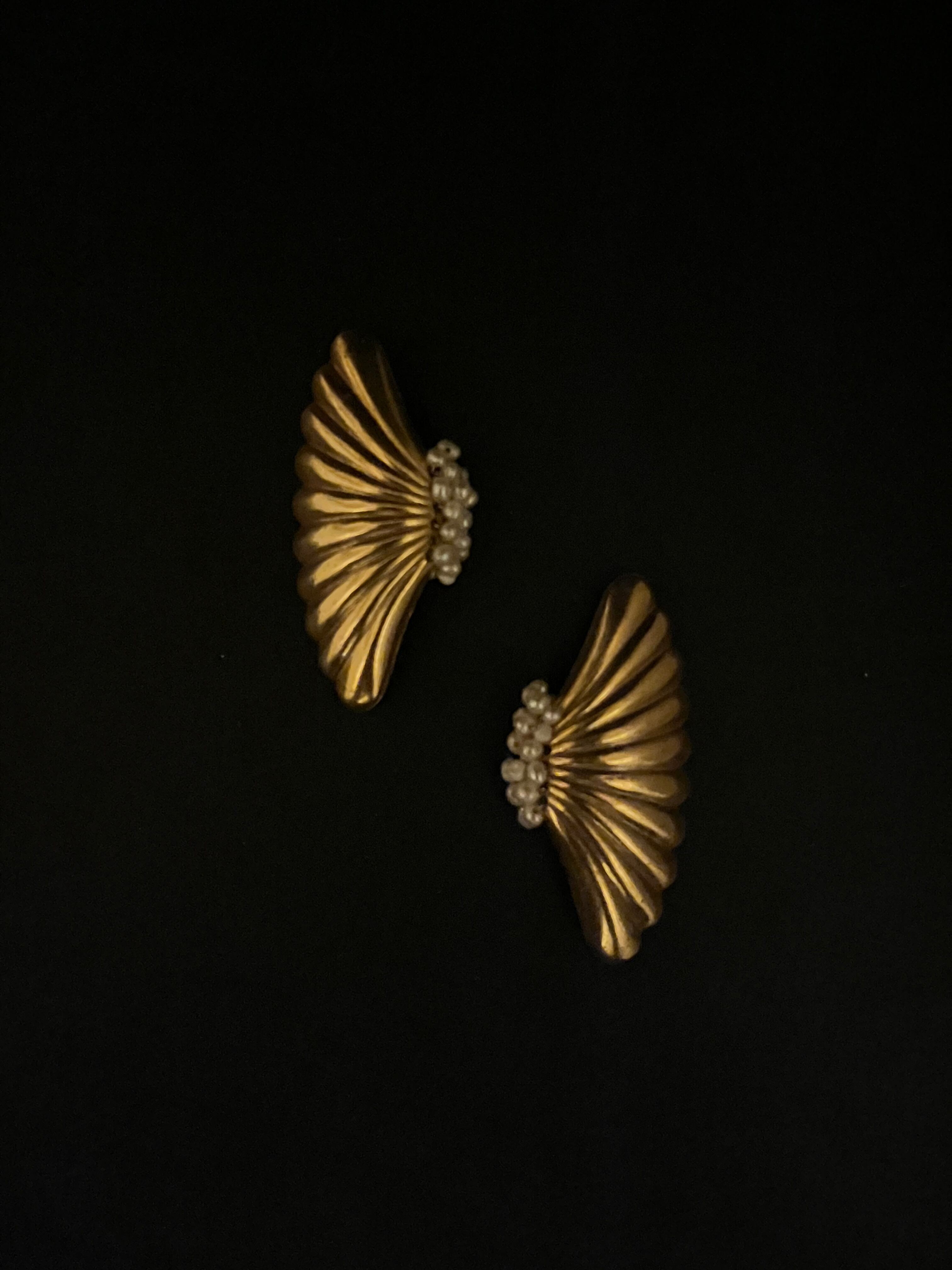 コスチュームジュエリーと言えばのミリアムハスケルの貴重なヴィンテージのメタルパーツに小さな小さい淡水パールを纏わせて、耳飾りに。