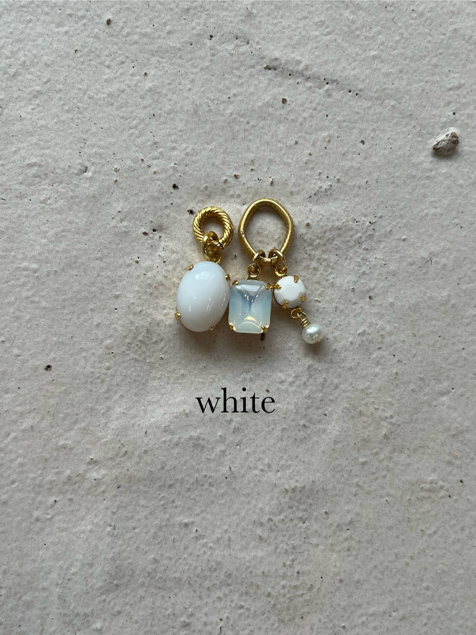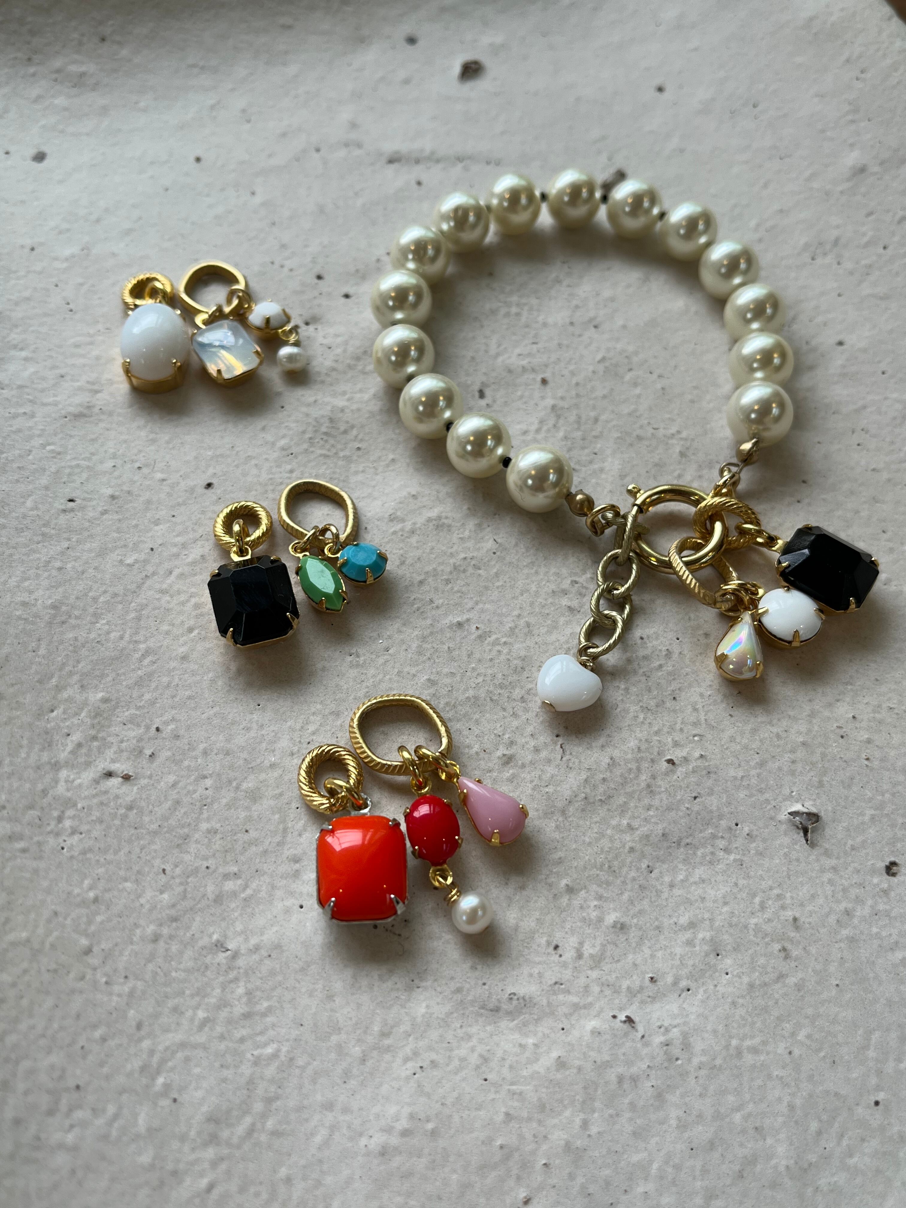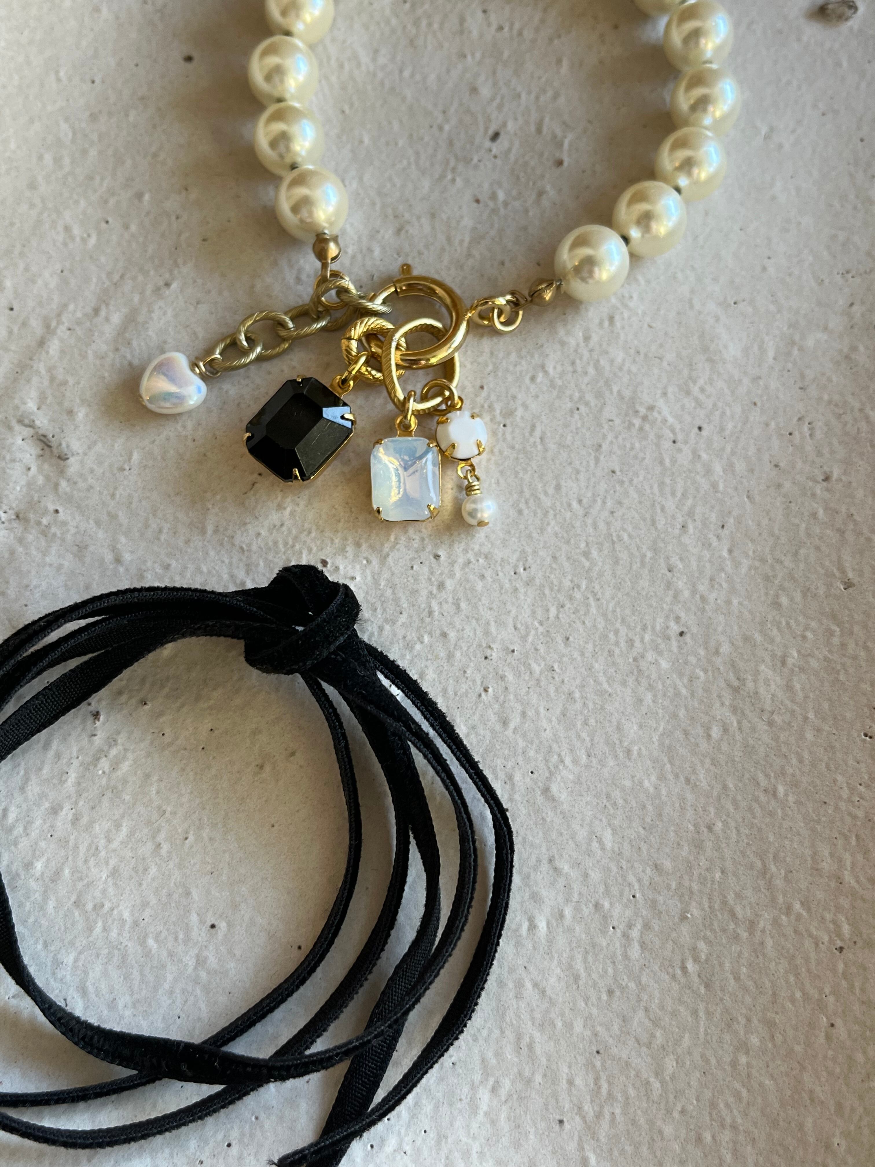 メインのブレスレットはジャパンヴィンテージのガラスパール。一粒が9mmのボリュームがあり、つけるだけでも手元が華やかになります。取り外し可能なチャームは付属のベルベットの細いリボンに通して、チョーカーやブレスレットとして別でも使用可能。また、お手持ちのチェーンネックレスやフープピアスに通していただくと更にお楽しみいただけます。