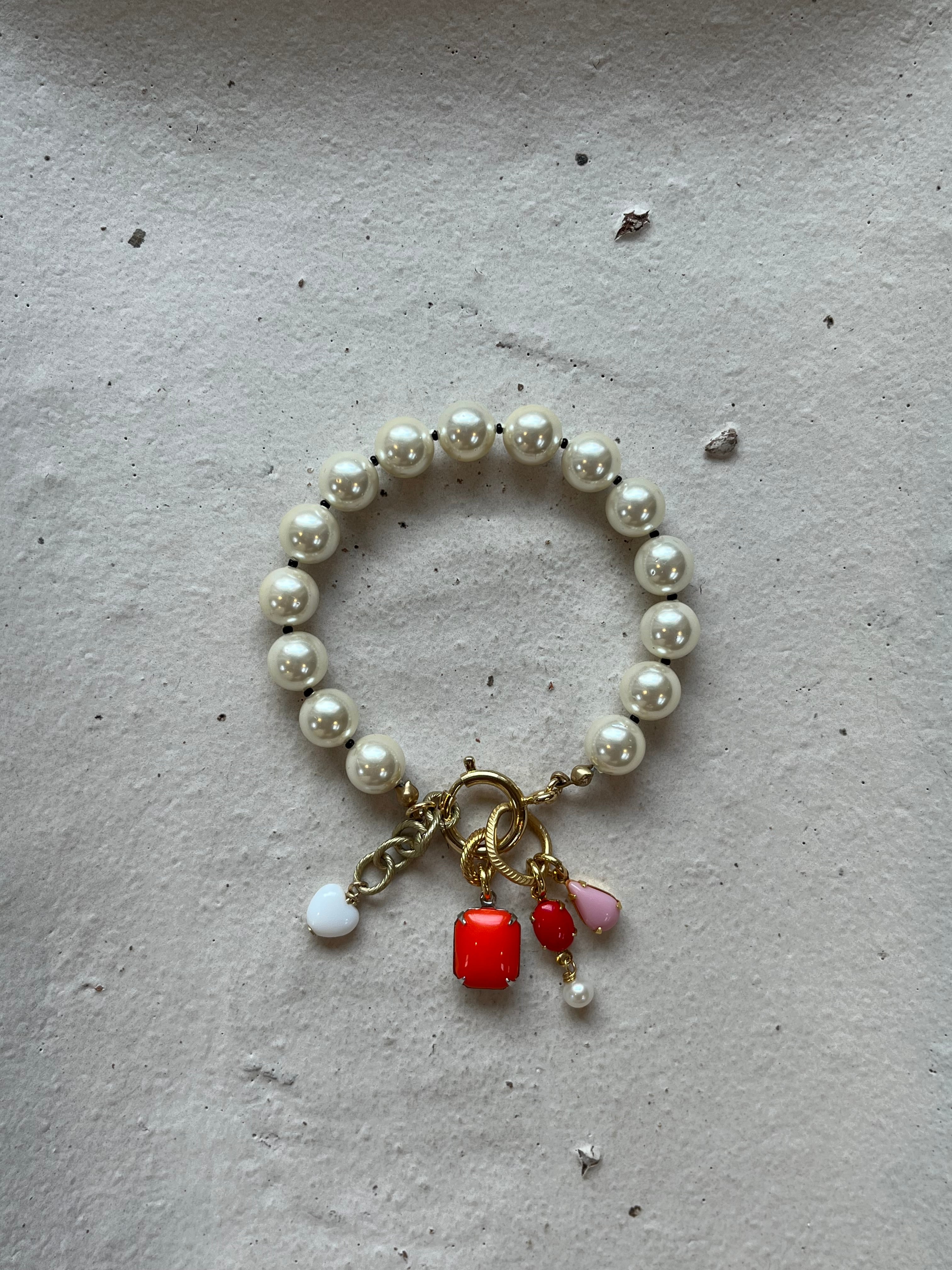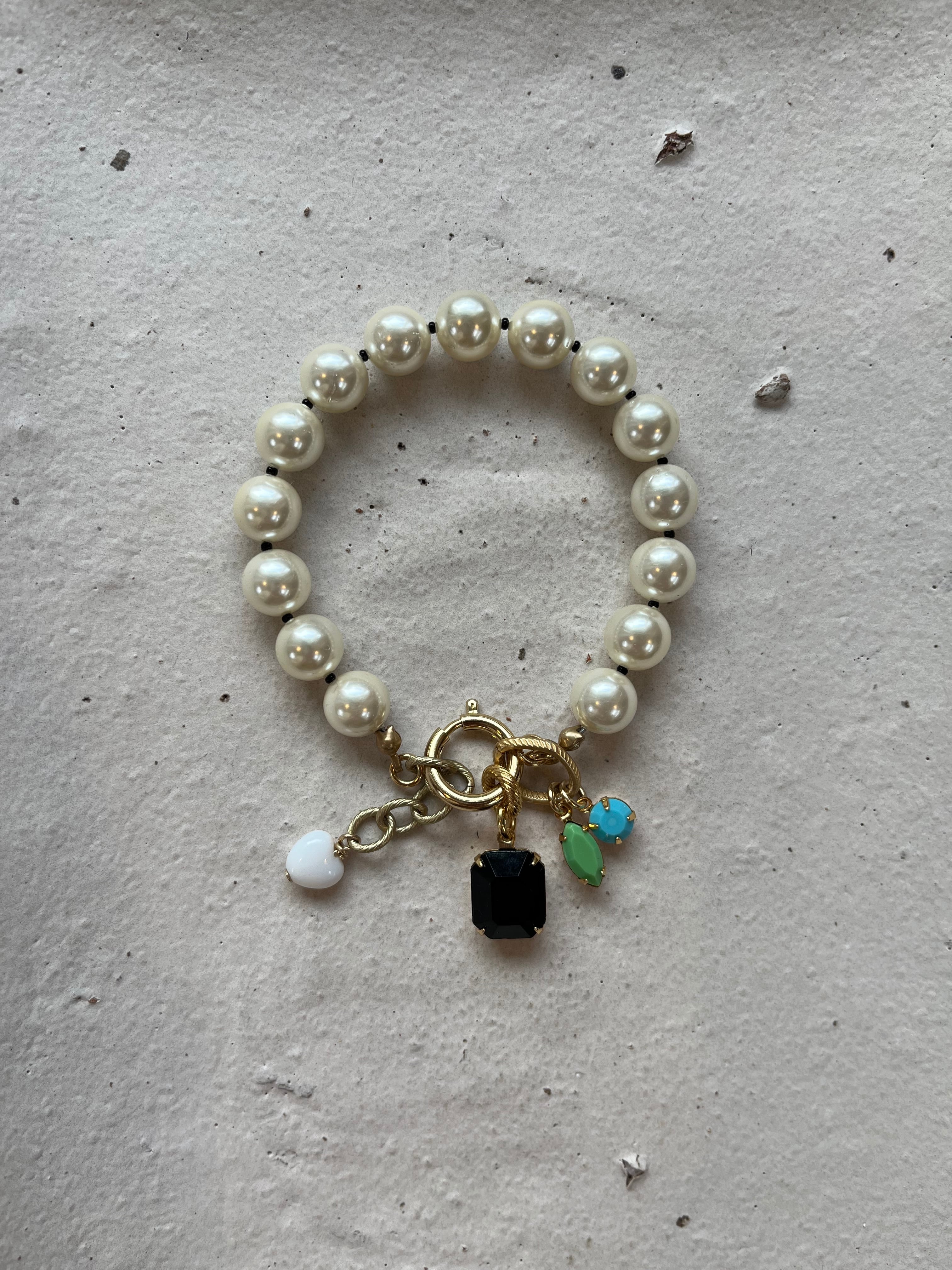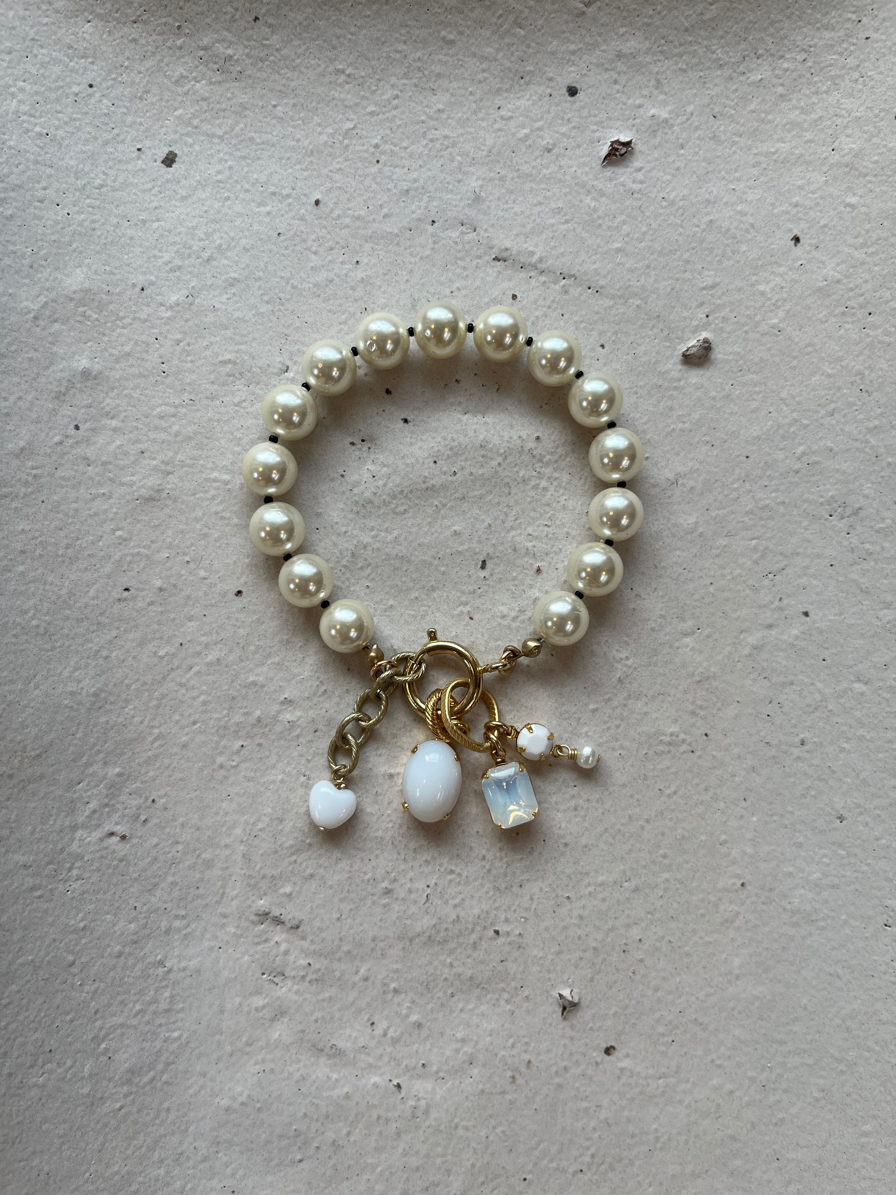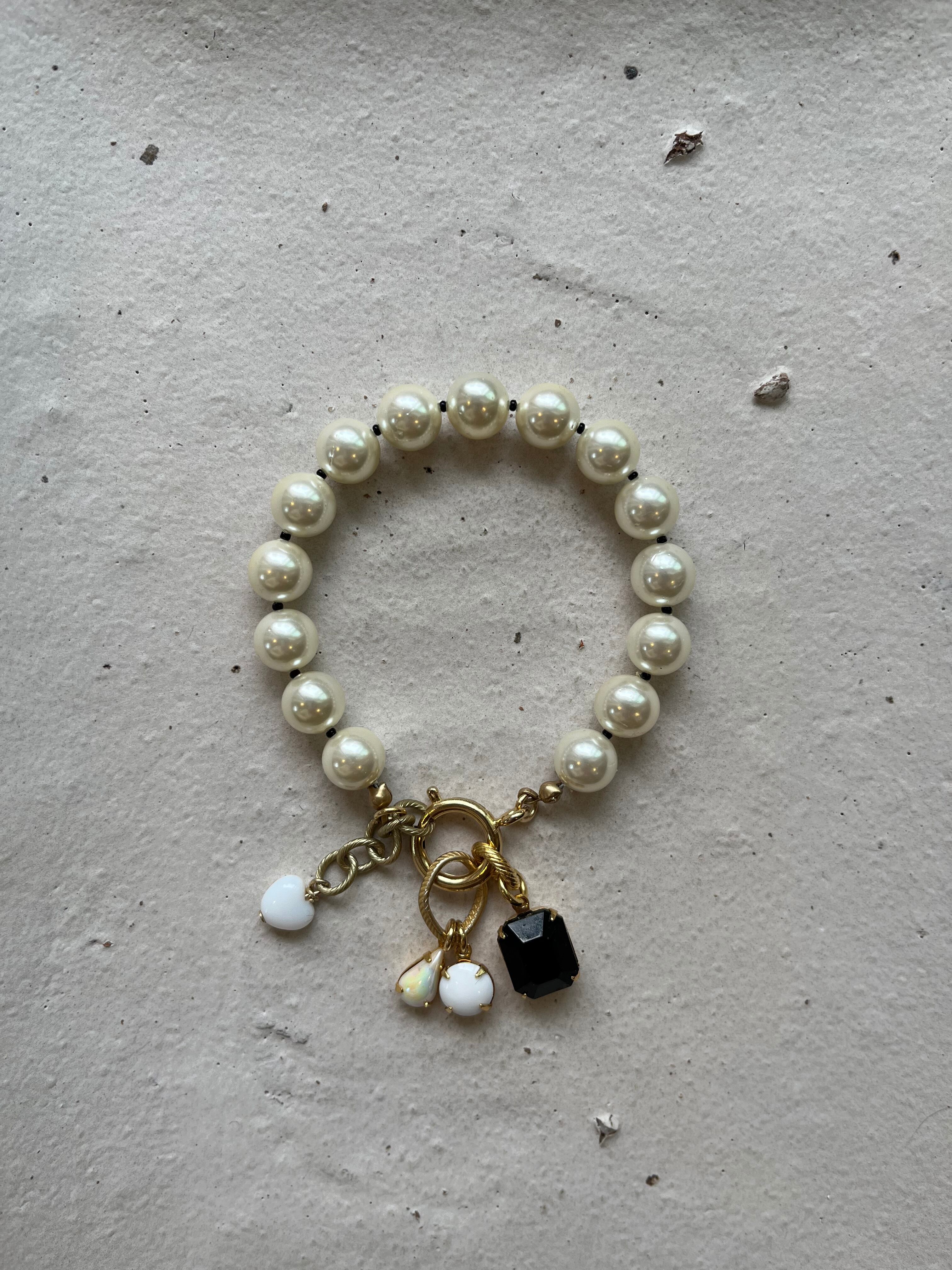 メインのブレスレットはジャパンヴィンテージのガラスパール。一粒が9mmのボリュームがあり、つけるだけでも手元が華やかになります。取り外し可能なチャームは付属のベルベットの細いリボンに通して、チョーカーやブレスレットとして別でも使用可能。また、お手持ちのチェーンネックレスやフープピアスに通していただくと更にお楽しみいただけます。