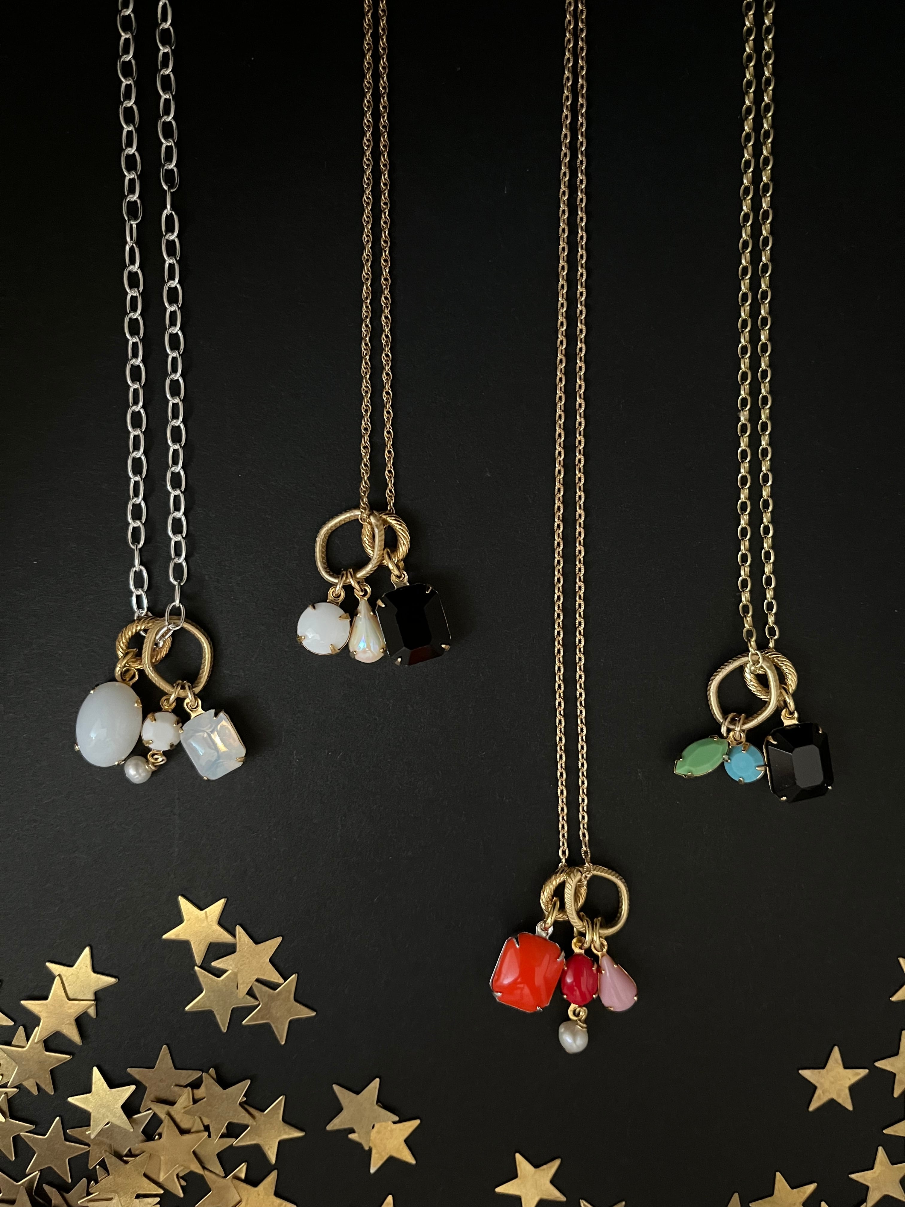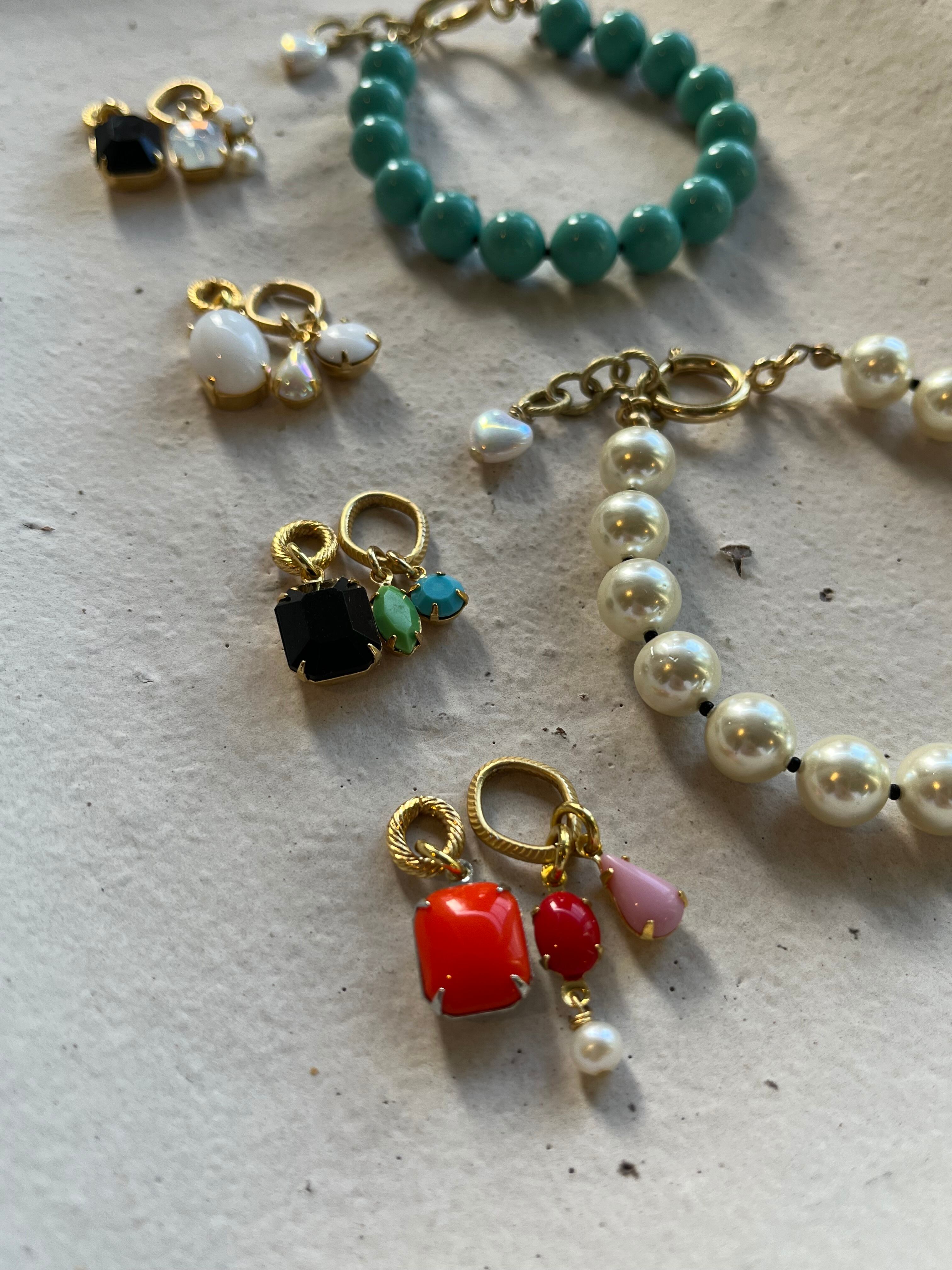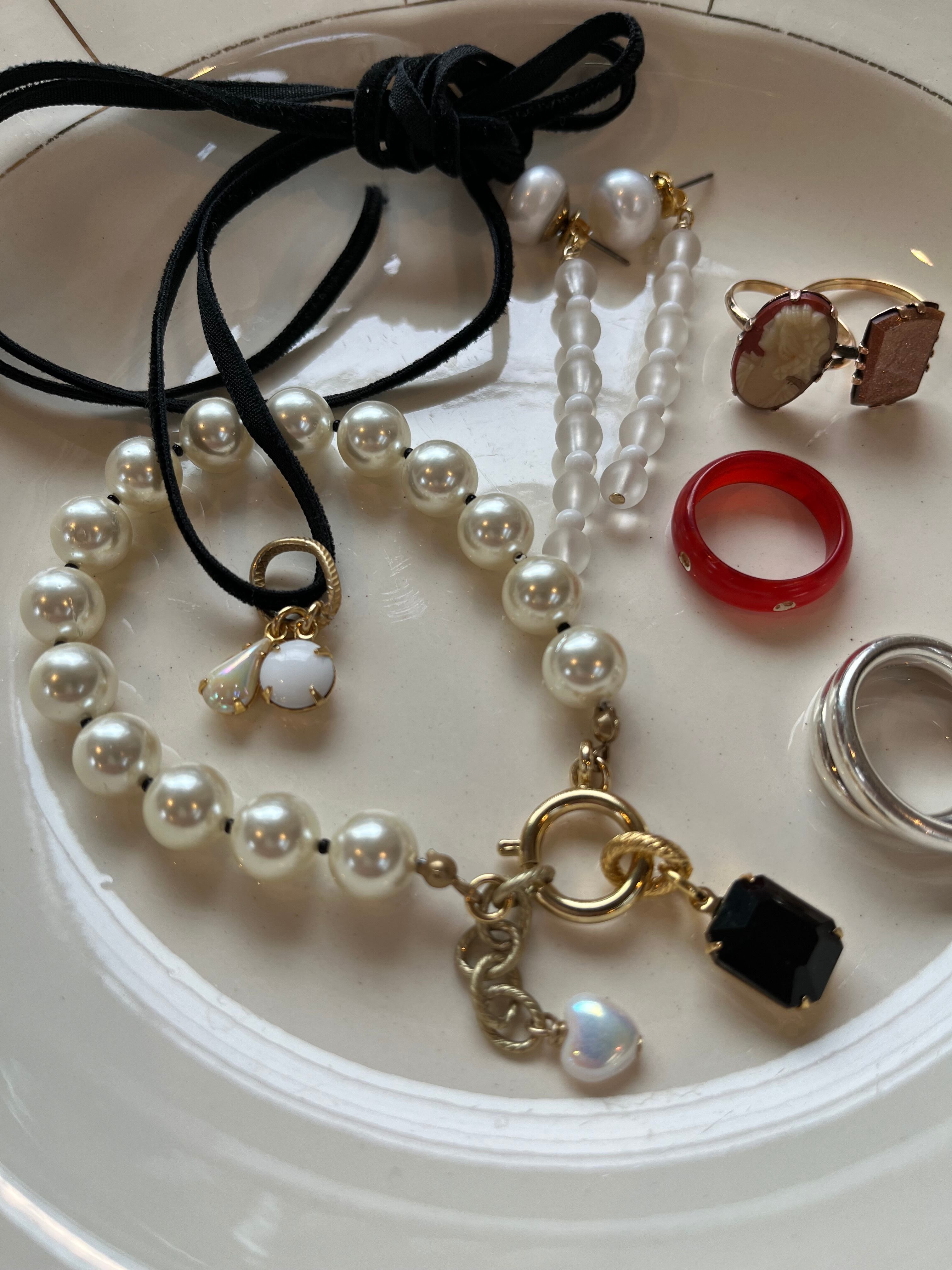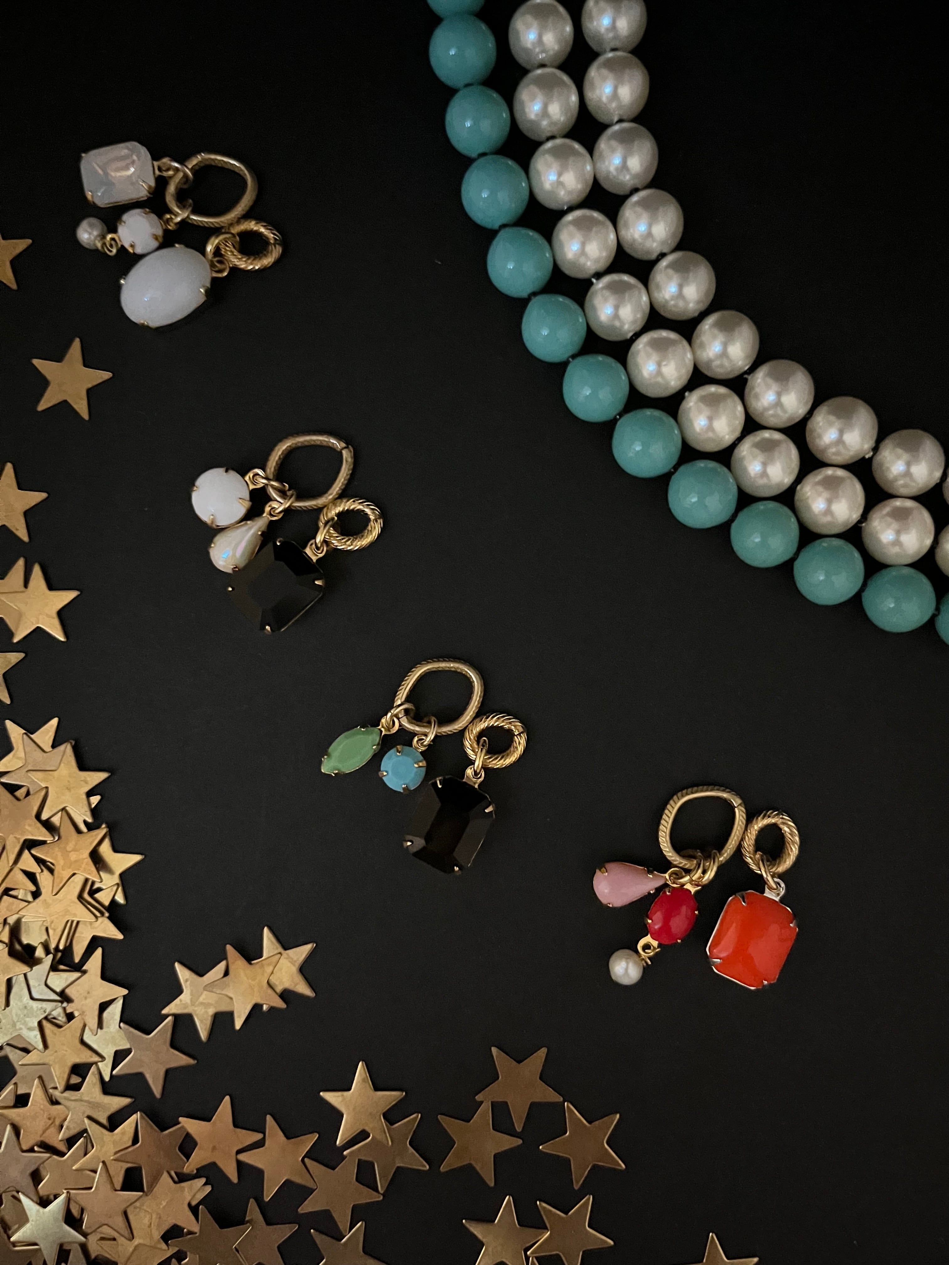ひとつひとつのストーンに模様があったり質感が違ったりと個性的なので単調にはならず動きを感じます。華やかな雰囲気ではありますが、ヴィンテージガラスならではの上品かつ落ち着いた彩度の良さが際立つのでカジュアルな装いにも楽しんでお着けいただけます。