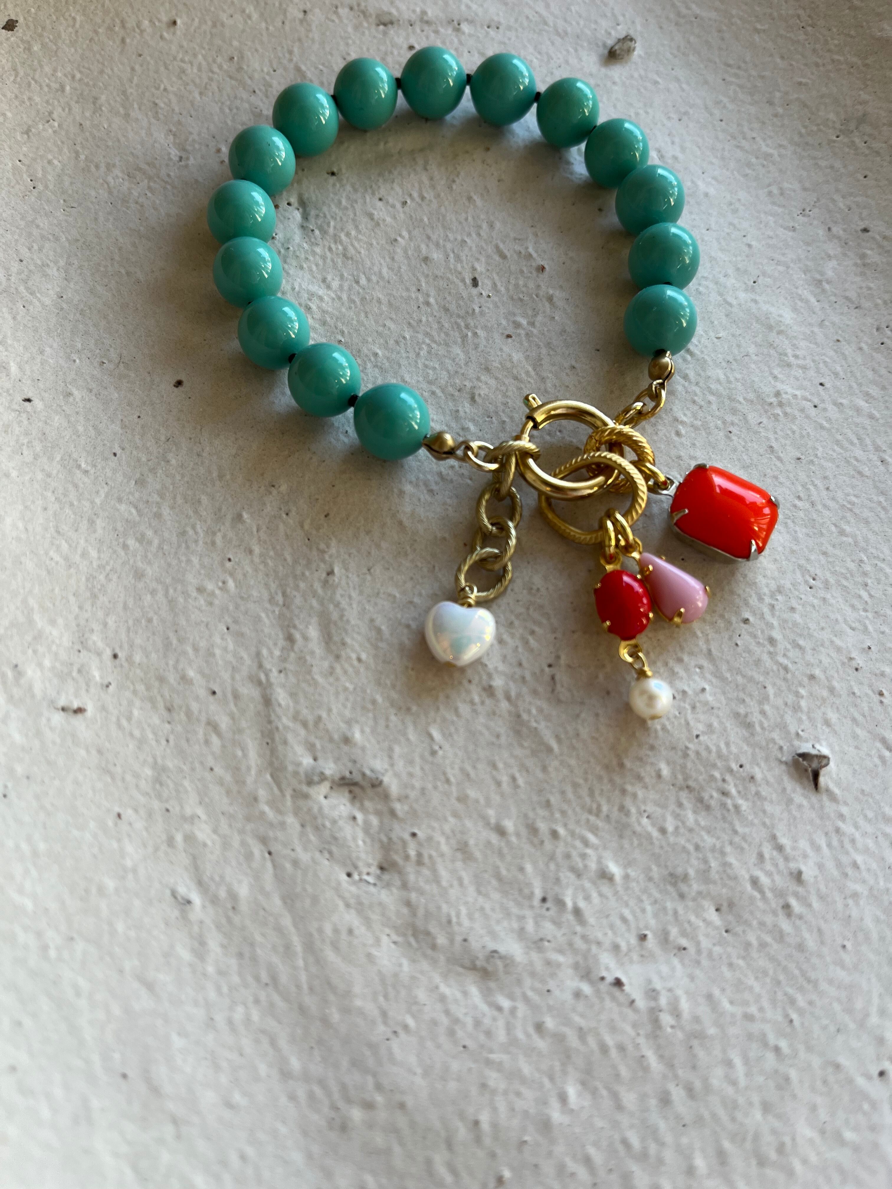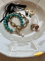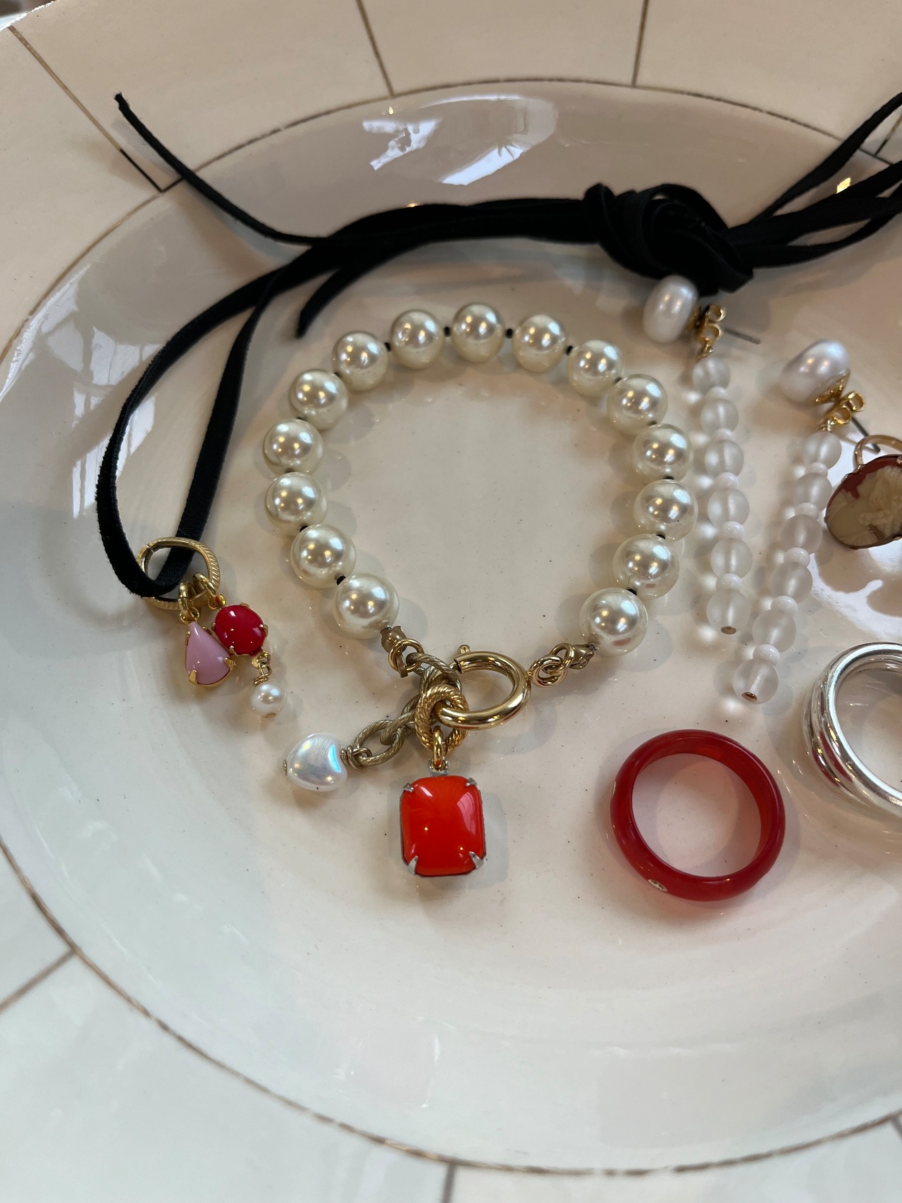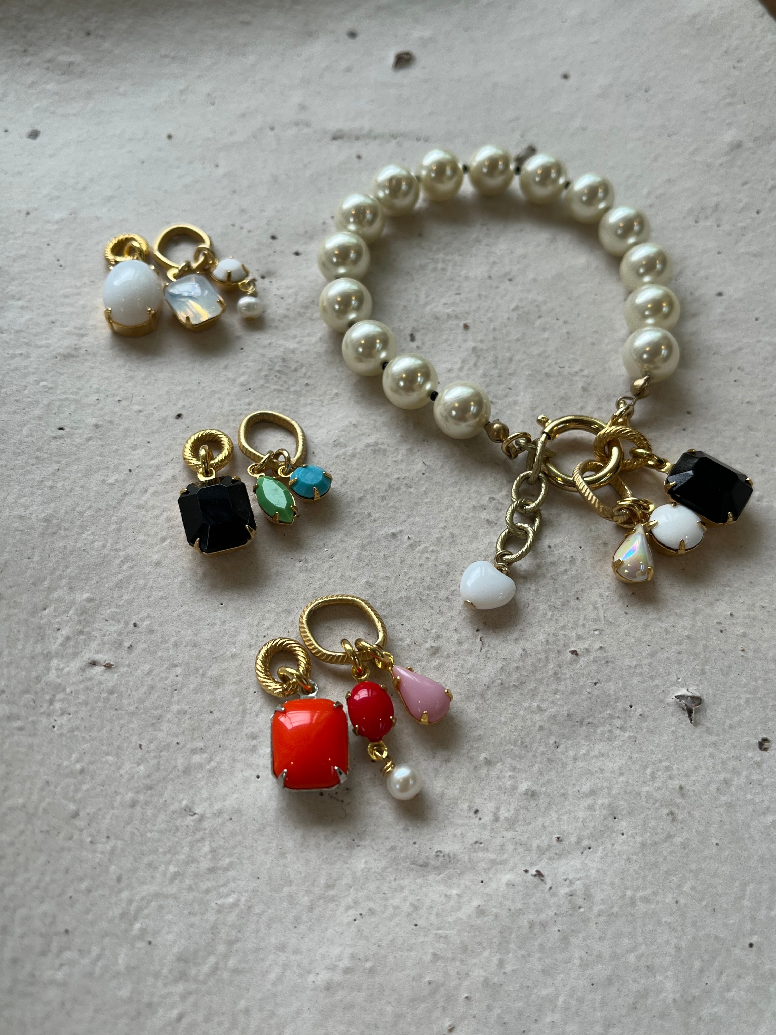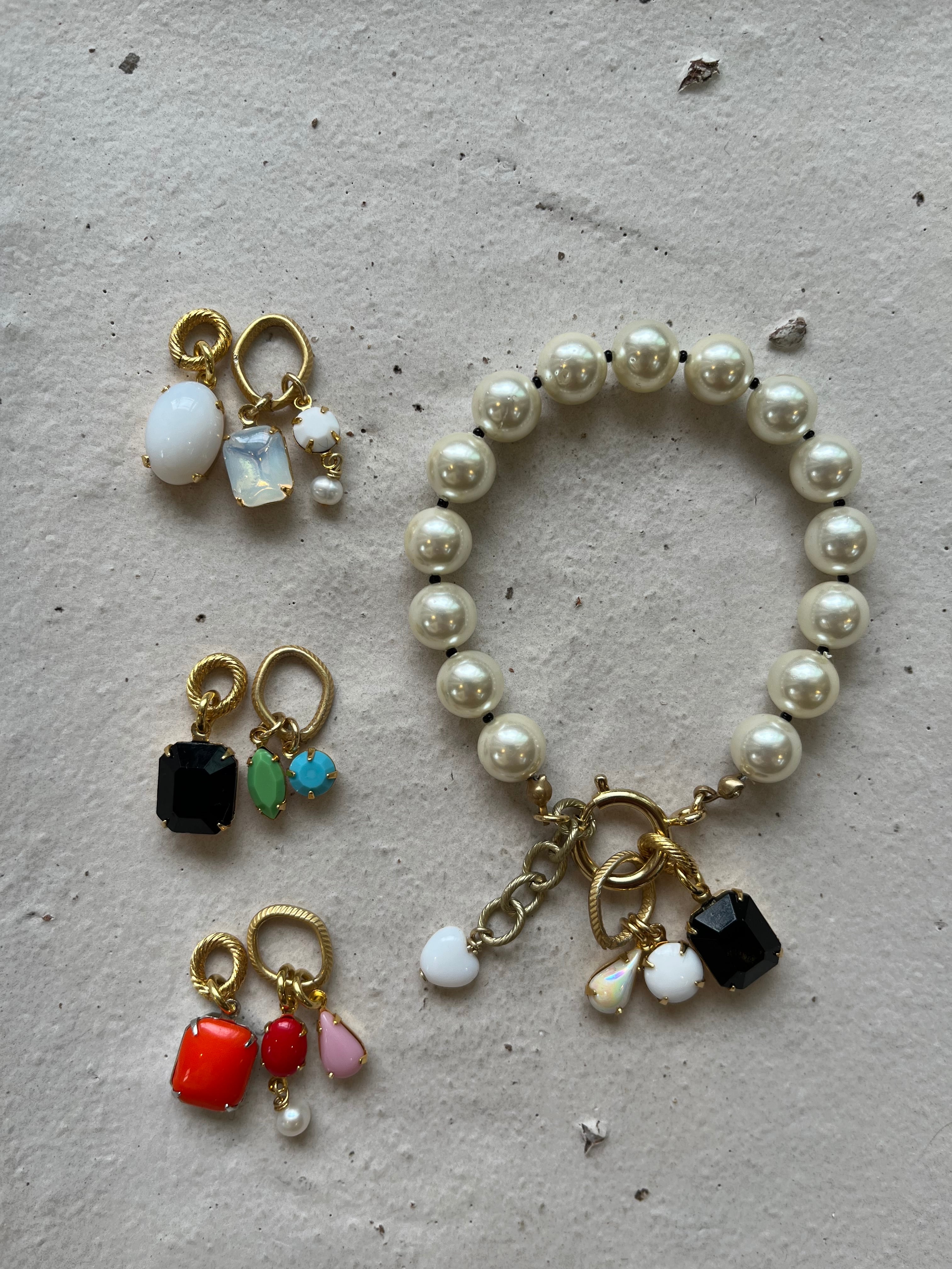 ひとつひとつのストーンに模様があったり質感が違ったりと個性的なので単調にはならず動きを感じます。華やかな雰囲気ではありますが、ヴィンテージガラスならではの上品かつ落ち着いた彩度の良さが際立つのでカジュアルな装いにも楽しんでお着けいただけます。