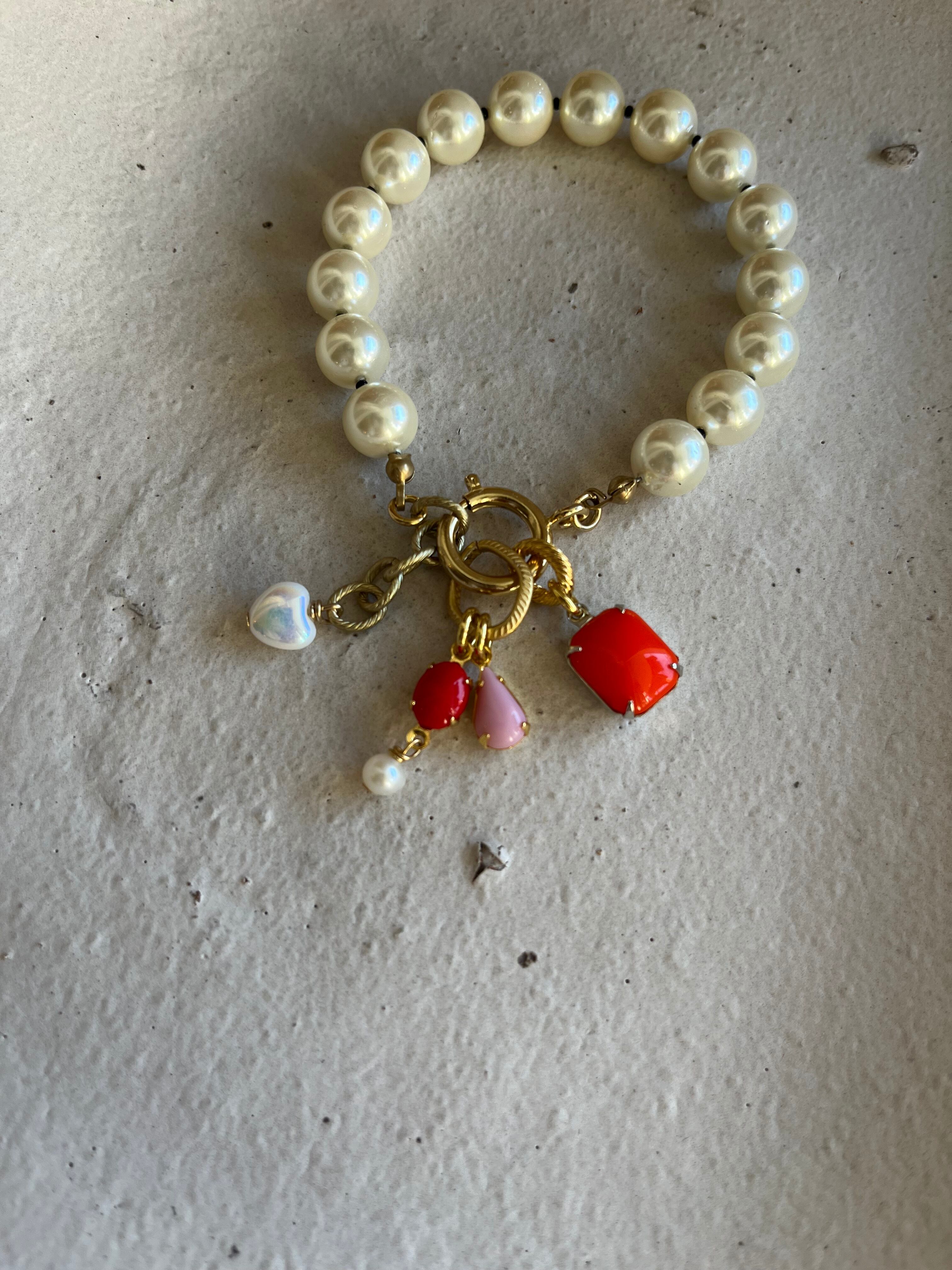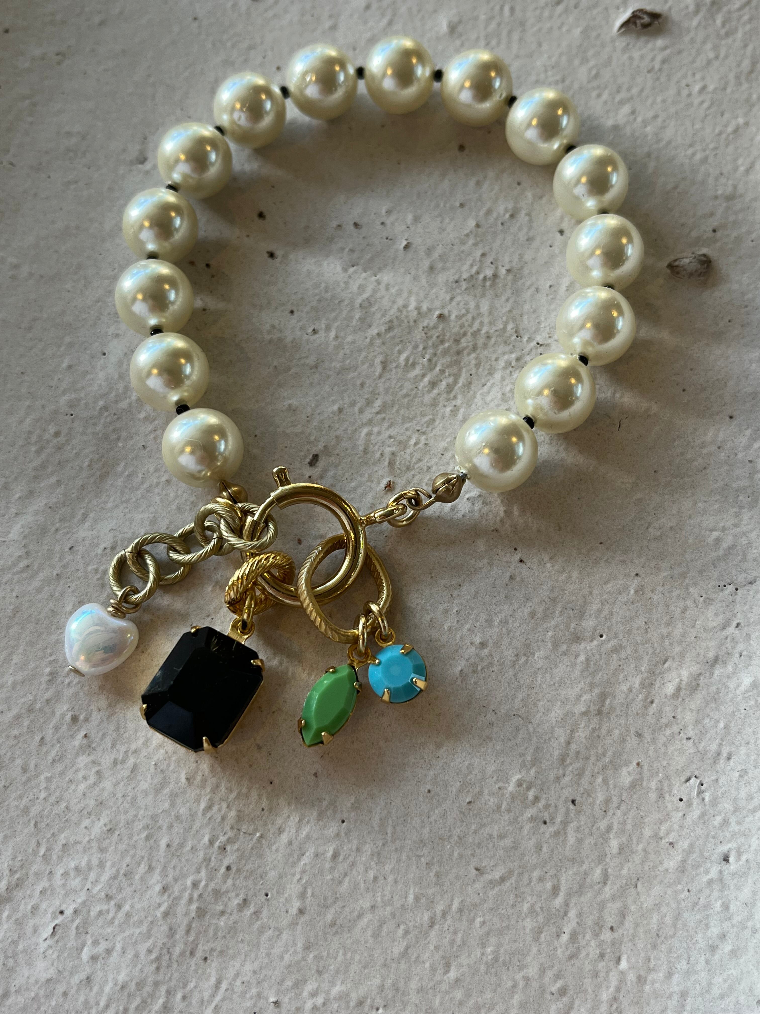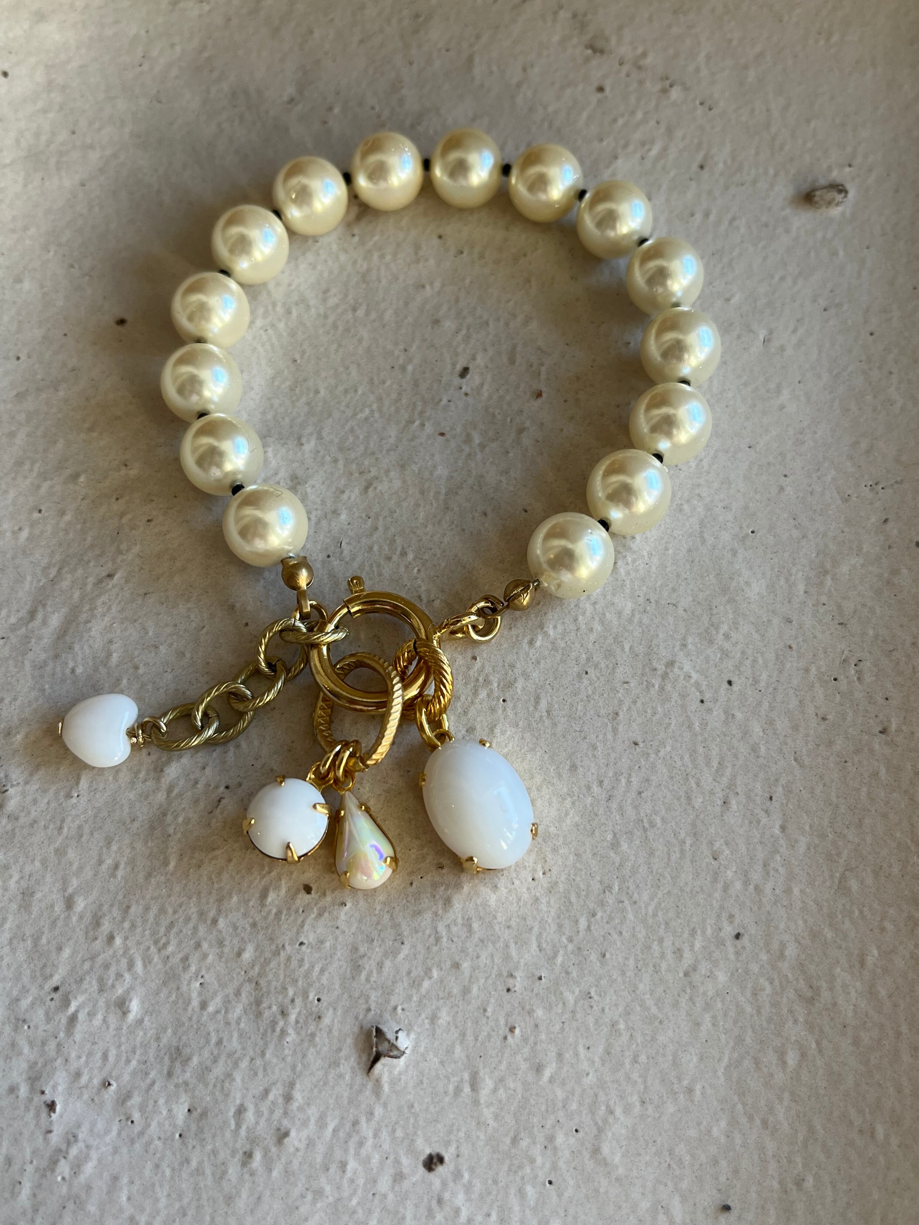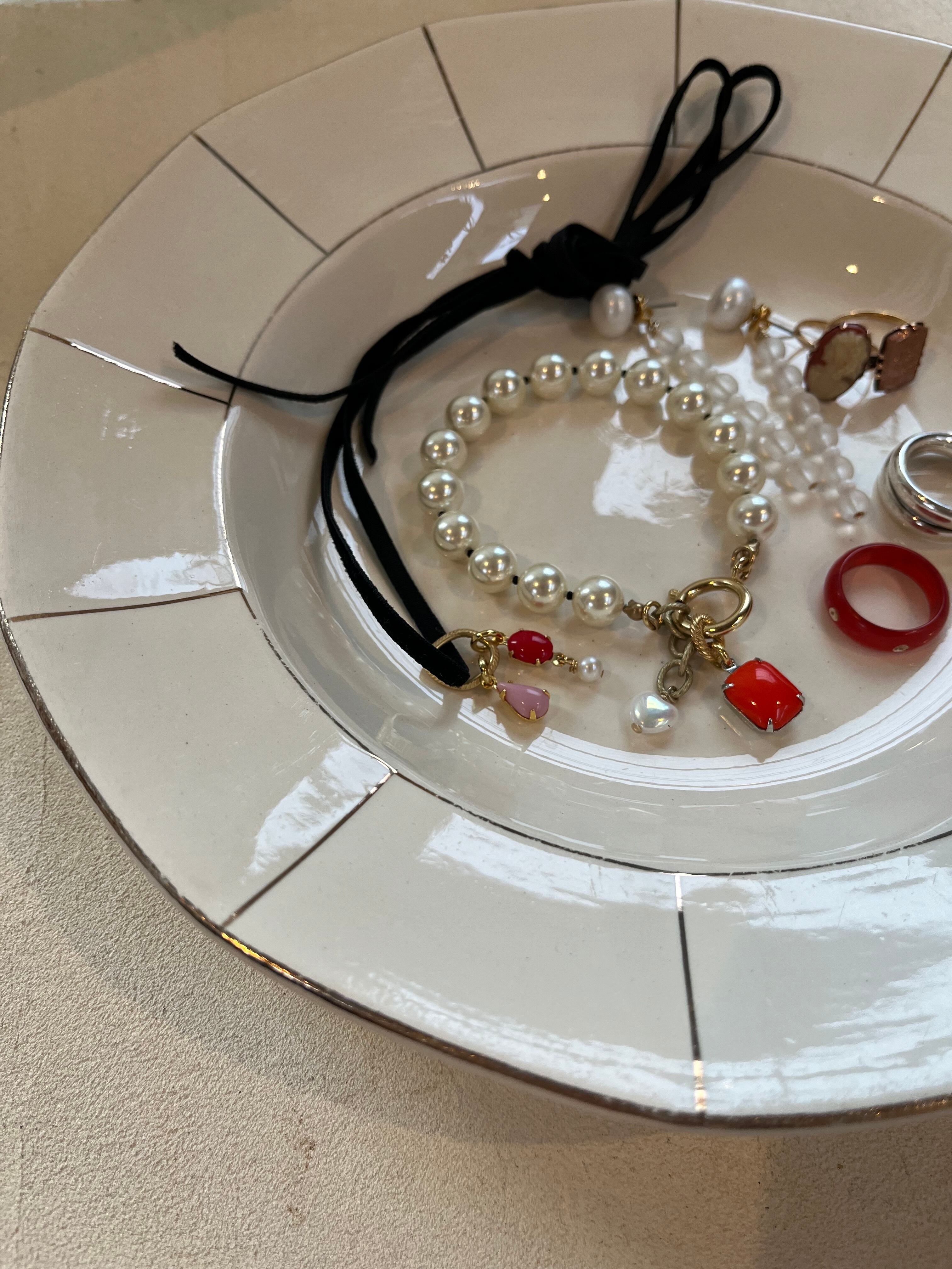 ひとつひとつのストーンに模様があったり質感が違ったりと個性的なので単調にはならず動きを感じます。華やかな雰囲気ではありますが、ヴィンテージガラスならではの上品かつ落ち着いた彩度の良さが際立つのでカジュアルな装いにも楽しんでお着けいただけます。