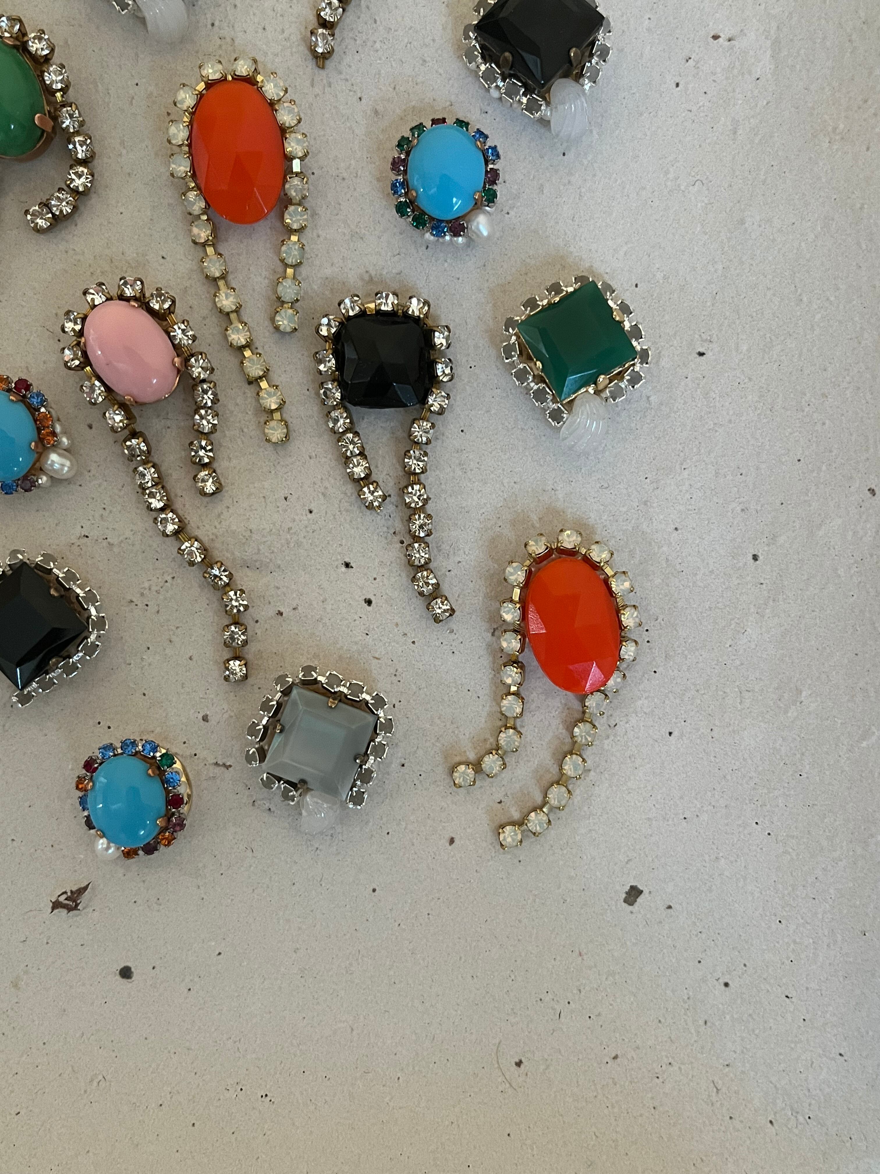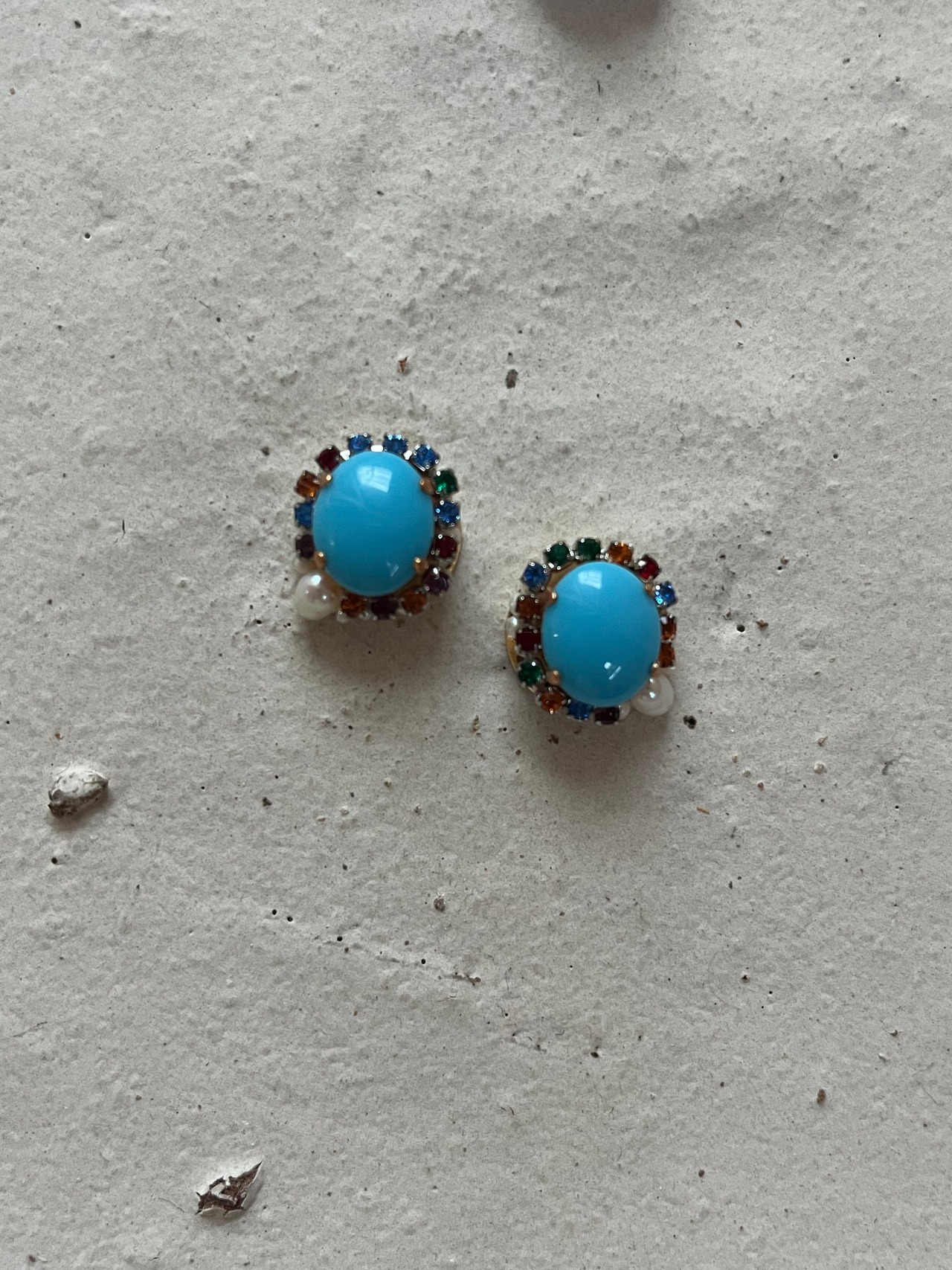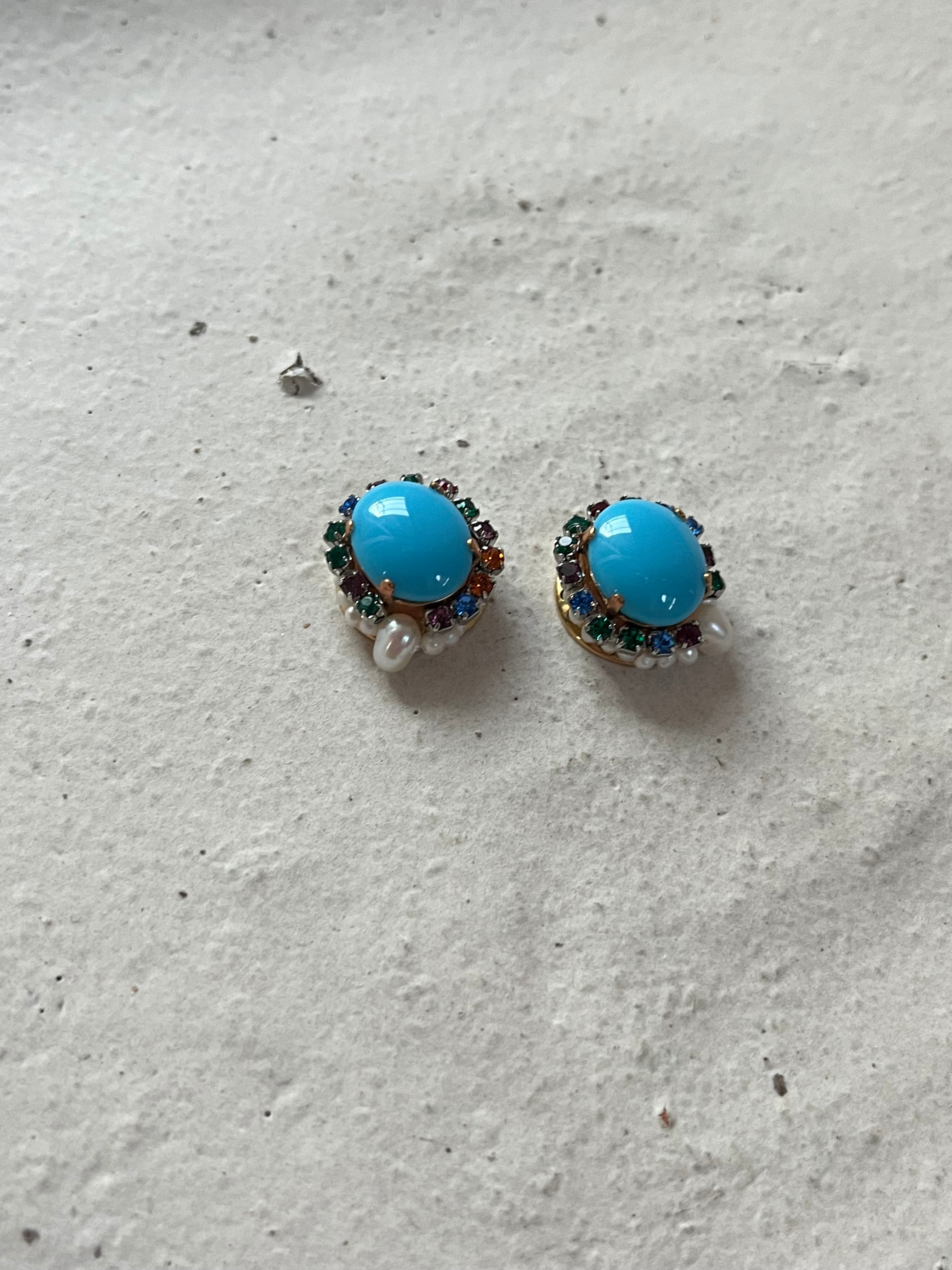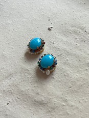 ヴィンテージならではの発色の良いブルーのガラスストーンの周りにカラフルなガラスが埋まっているストーンチェーンを纏わせて小さな惑星のようなピアスを制作しました。