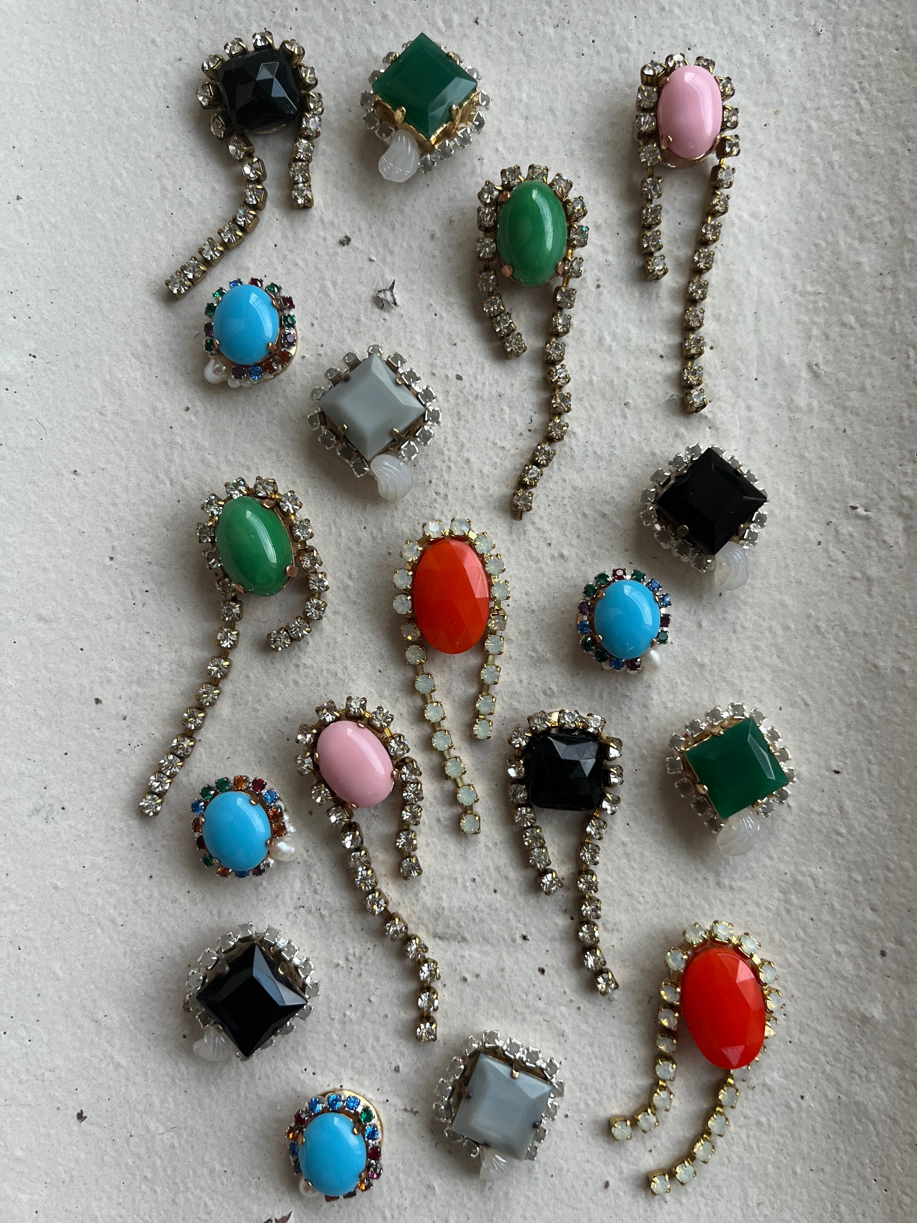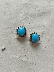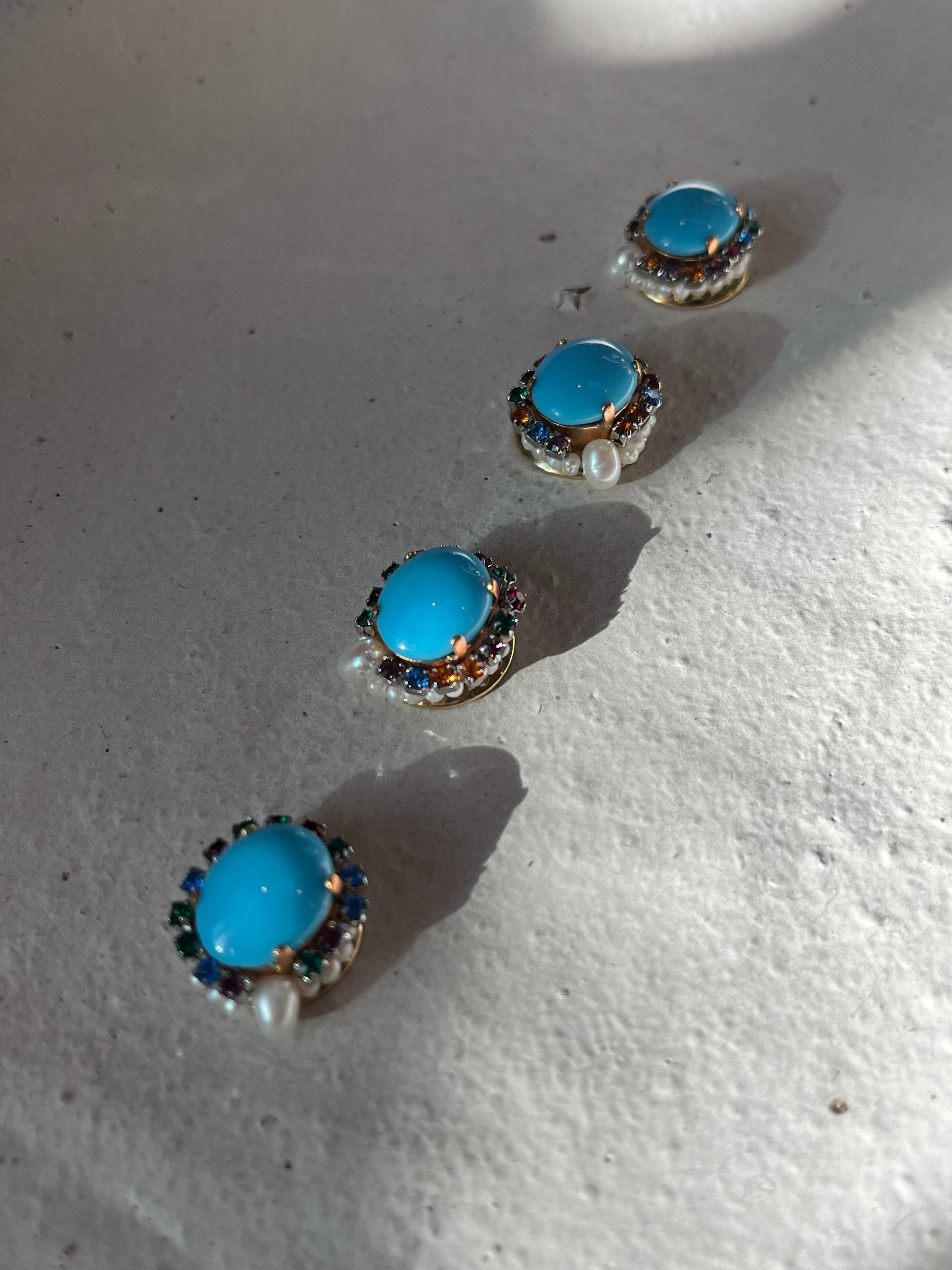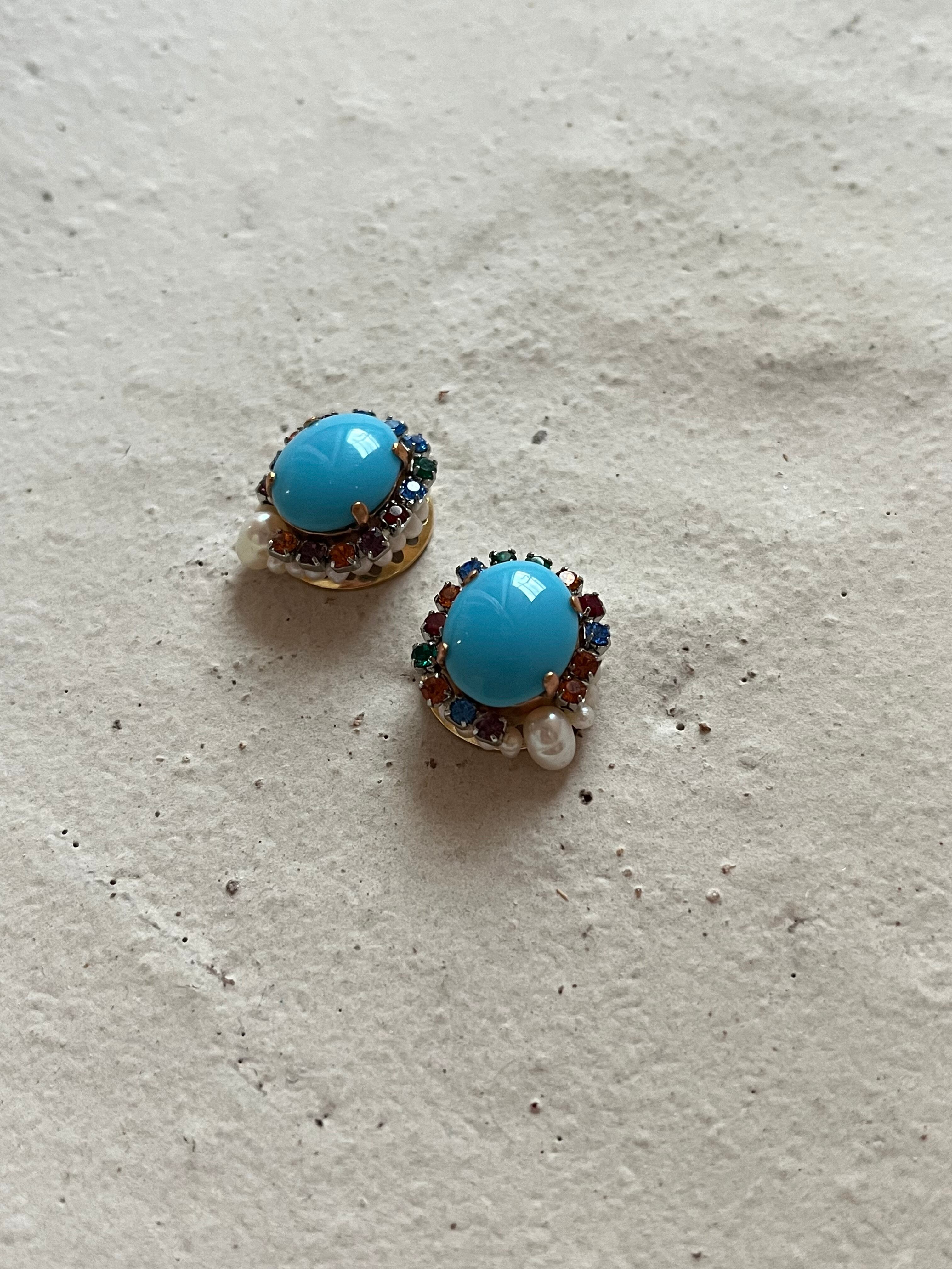 ヴィンテージならではの発色の良いブルーのガラスストーンの周りにカラフルなガラスが埋まっているストーンチェーンを纏わせて小さな惑星のようなピアスを制作しました。