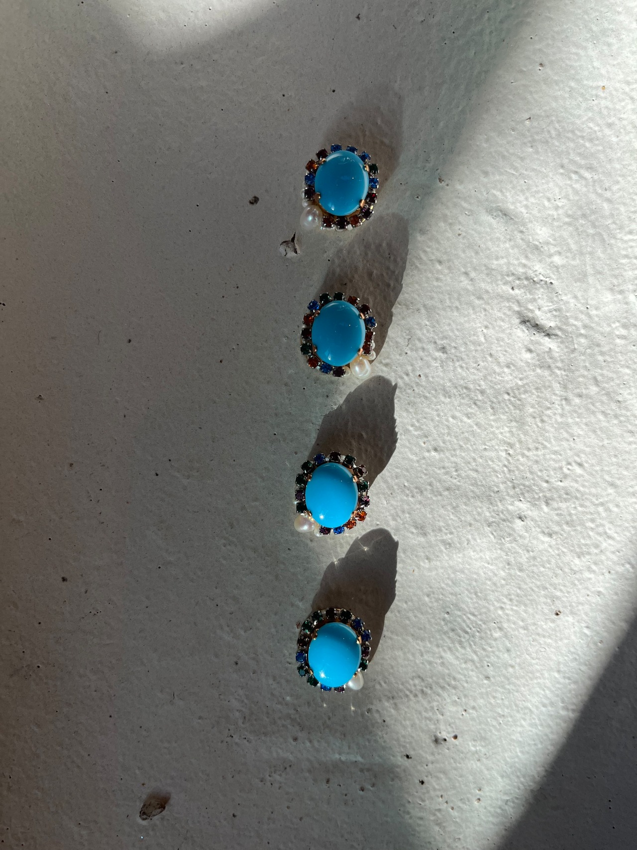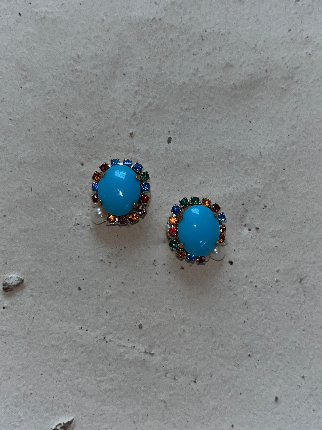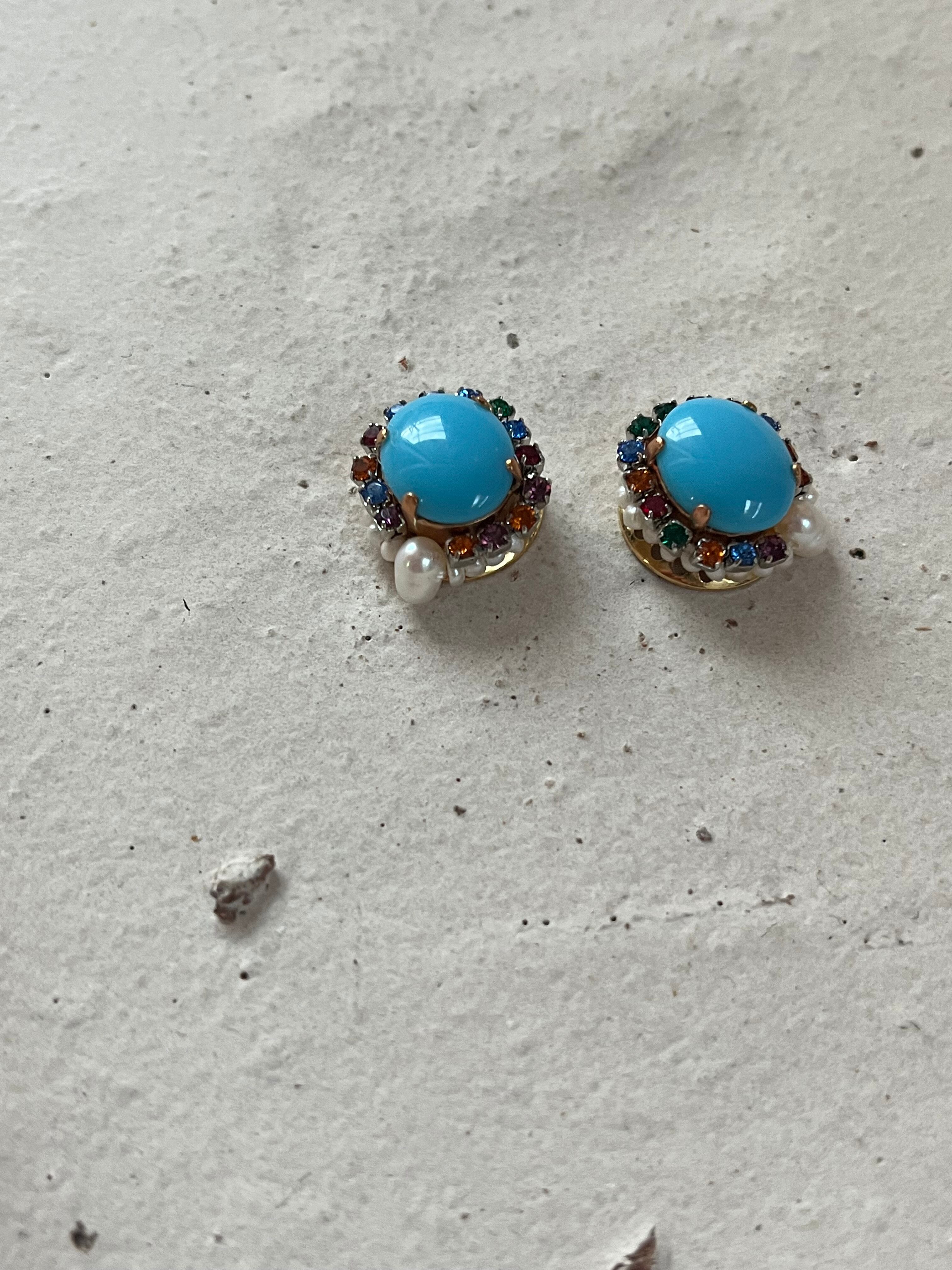 ヴィンテージならではの発色の良いブルーのガラスストーンの周りにカラフルなガラスが埋まっているストーンチェーンを纏わせて小さな惑星のようなピアスを制作しました。