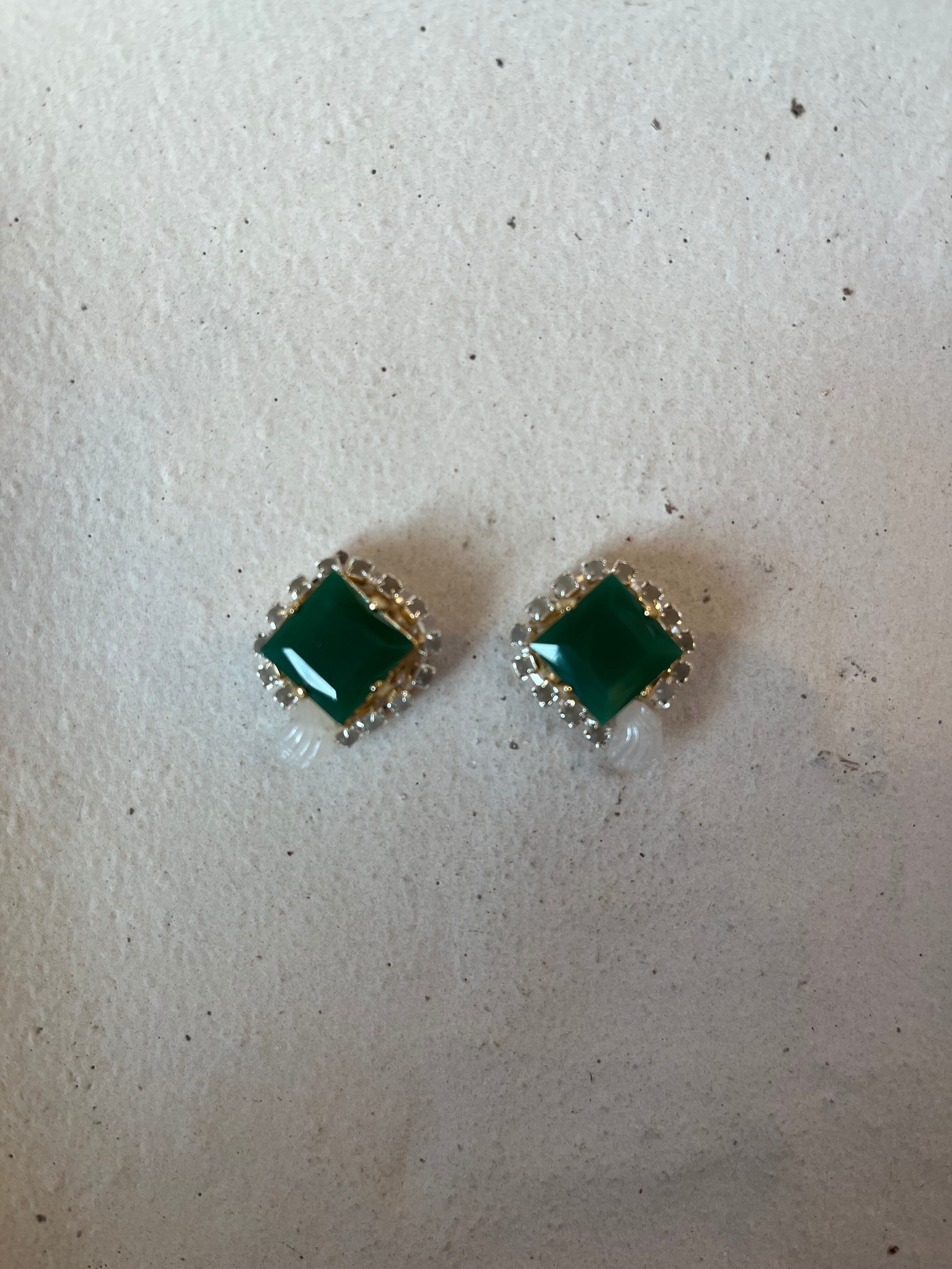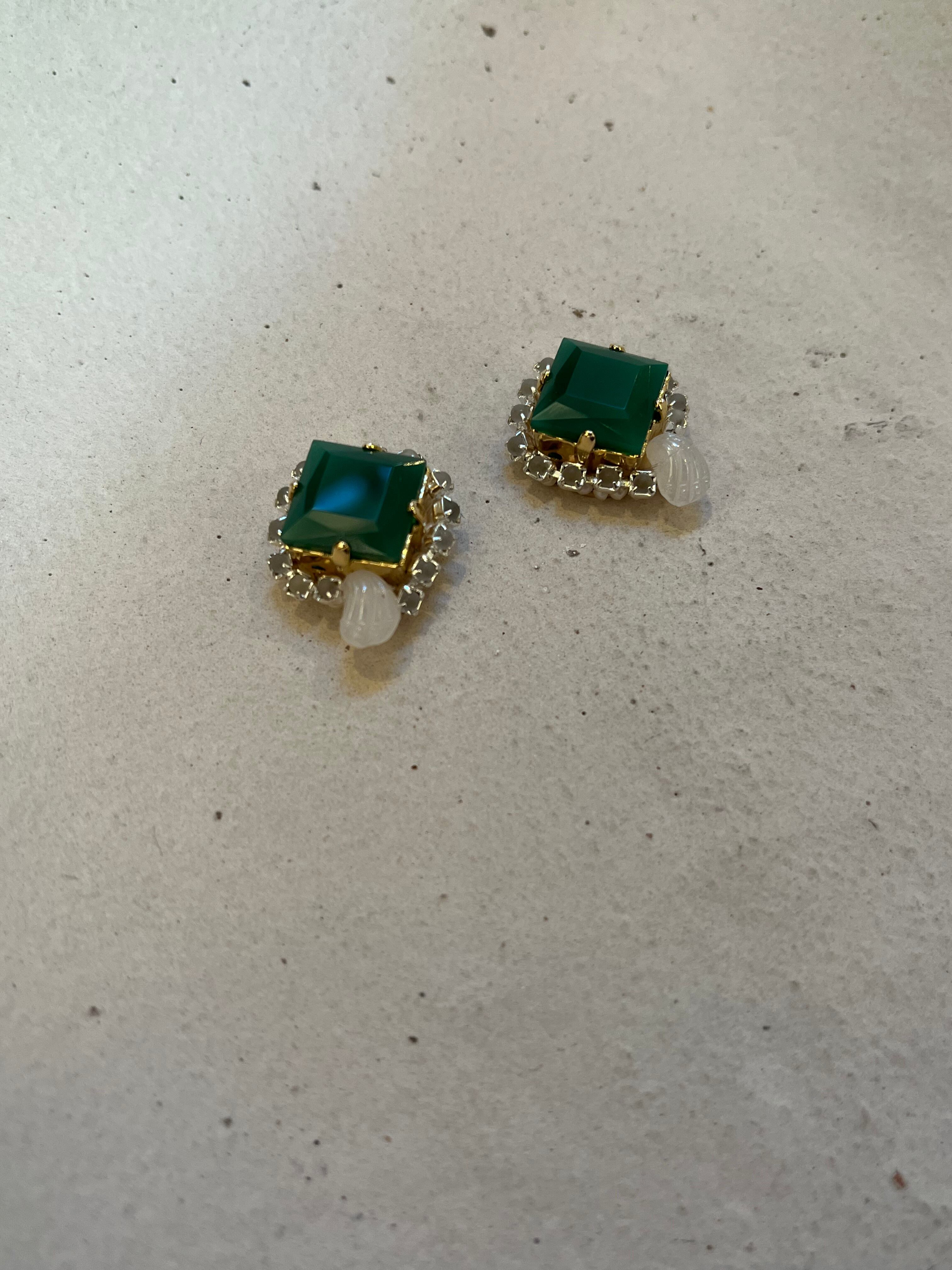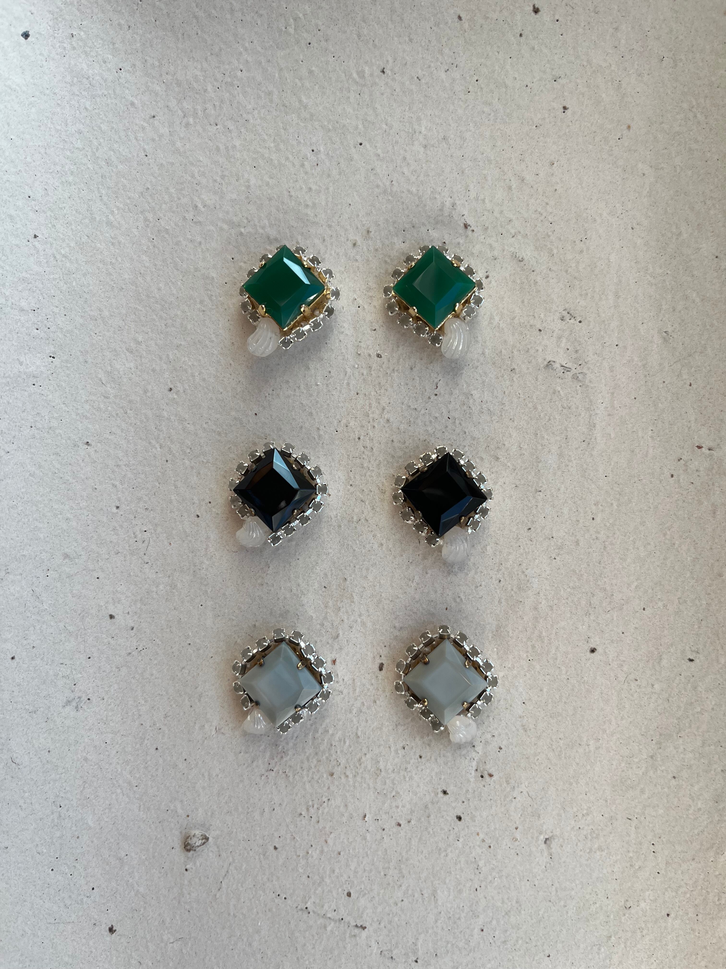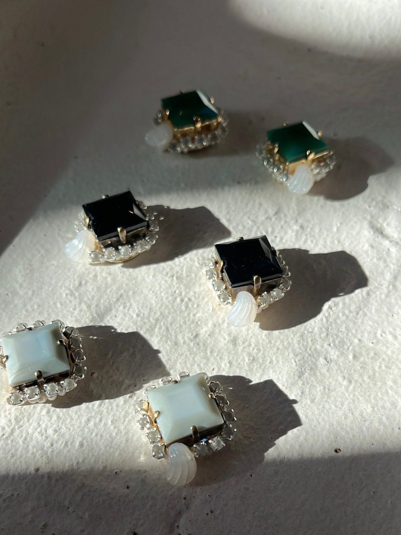 艶やかなヨーロッパ製のスクエアのガラスストーンの周りにはマットなフロスト加工してあるガラスが埋まっているストーンチェーンを纏わせて、小さな惑星のようなピアスを制作しました。